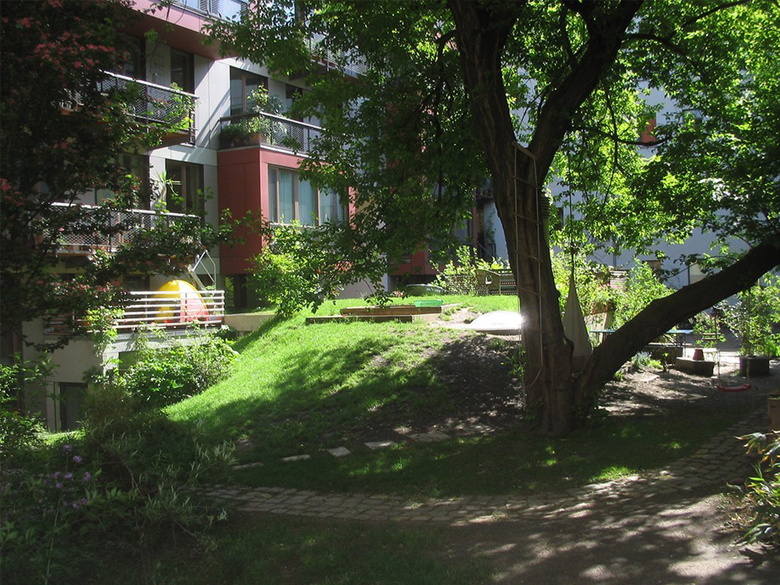 Der Neubau bildet mit dem Altbauwinkel einen Gartenhof im Blockinnern. Die klare bauliche Struktur des Neubaus, sparsam ausgeführt in Stützenkonstruktion, gewährt grosszügige, flexibel gestaltbare Wohnungsgrundrisse in kostengünstiger Bauweise.