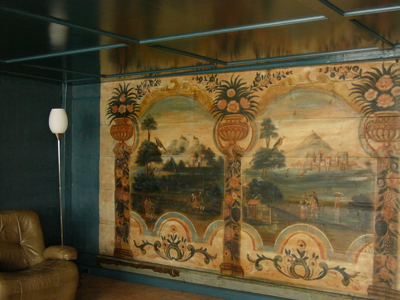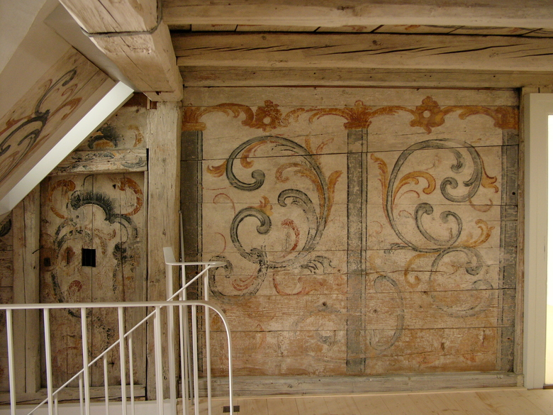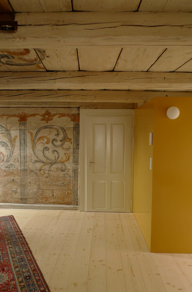 Die Erschliessung vom 2. OG zu DG sollte verbessert, sowie das DG isoliert und mit einer Nasszelle ergänzt werden. Die Rankenmalereien auf den Bohlenbrettern zum Estrich und die nicht tragende Trennwand im Giebelzimmer waren ein Indiz, dass das Giebelzimmer einst prominenter genutzt wurde. Eine Sondier Bohrung durch eine Schicht Spanplatte und eine Schicht Feldertäfer liess etwas Farbiges sichtbar werden: die raumhohen Wandbilder kamen zum Vorschein. Die dunkle Raumfarbe ist historisch nicht belegt, bringt aber die Wandbilder optimal zur Geltung. Das Isolationskonzept musste ganz neu und unkonventionell gelöst werden. Die Nasszelle wurde als Möbel konzipiert, um die Diele mit ihren Ranken als Gesamtraum zur Geltung zu bringen.