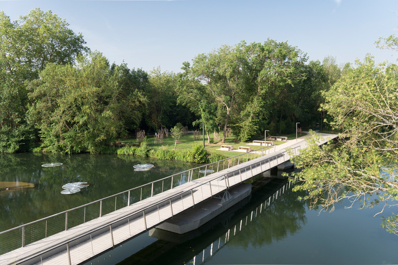 It is built on a floating structure and incorporates benches that transform it into a new belvedere that brings water users closer to the Clain. The route on the river takes the form of a ricochet, barely razing the water to cross from one island to another. The use of floating supports ensures lightness and transparency without modifying the river bed. During floods the structure floats.