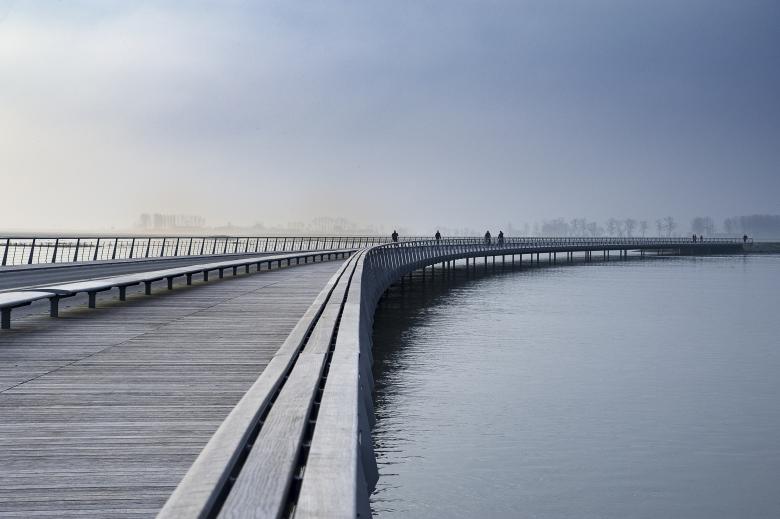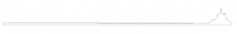 The causeway becomes part of the bay by virtue of its curvy geometry that embraces the bay and accompanies the walker. Following the lines designed by water, the causeway suggests multiple views around the Mount. Perfectly horizontal, the deck merges into the horizon. A serpentine curve on a series of 134 pillars leads over the tideland up to the mount. The inspiration derives from the sight of a mussel farm with its sticks rising from the sea. The low structure nestles to the water almost touching it. The discrete character of the jetty has its origins in a very conscious relationship with the site. In fact, fixing pillars each 12m in the tideland in order to achieve such a flat construction height is a really elaborate operation. More than a simple crossing, the close alignment of the pillars suggests the act of walking towards water, of approaching it slowly.