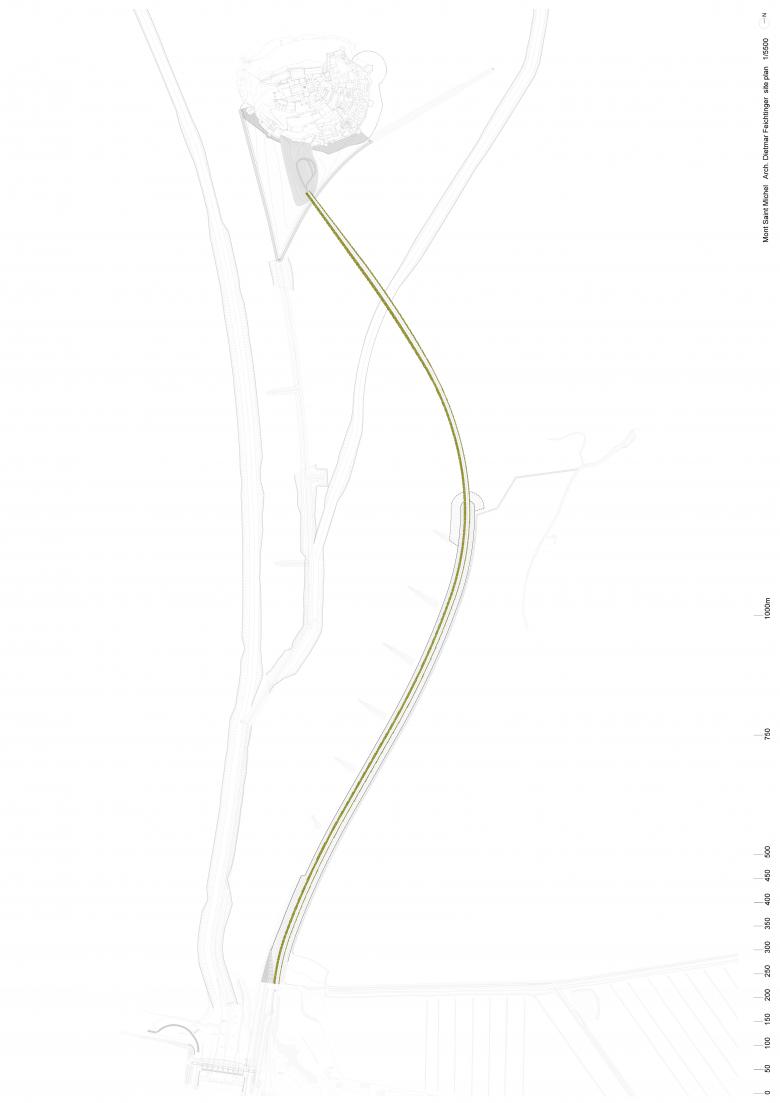 The changing sea level, caused by the tides rising it up to 14m, creates a repeated event exposing the forces of nature and offers a variety of landscapes alternating between an immense sand beach or a completely flooded bay with the Mount transformed into an island as only landmark. Basically, there are two tides a day which is quite exceptional that take a little more than 12hours. Twice a year, the annual flood peak will transform the Mont-Saint-Michel into an island by virtue of its jetty. Human intervention in this context is more than delicate. Consequently the project set itself the imperative of not disturbing the atmosphere and the wonder of the site due to its being mysterious and the absence of any marker points or scale. The intention of the project is to guarantee the continuity of the landscape as far as the eye can see. Visitors have to experience that they are part of an immense setting. The jetty design blends into the landscape as seamlessly as possible in order to reach the maximum of transparency. The flow of water is one of the major issues; it allows keeping the Mounts insularity and accelerates the dredging of the estuary. The rhythm established by the 134 pillars plays a key role in transforming the site again into an island. From the mainland to the Mount, the structure general geometry forms a continuous and fluid movement. Slightly offset to the East before turning back, it opens up wide views of the bay and the Tombelaine rock.The structure is minimal in its expression, it is very ambitious in its design and performance.