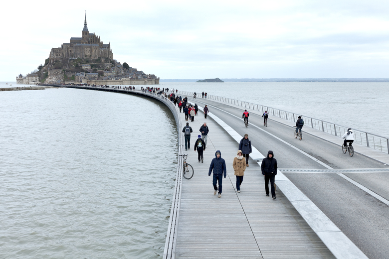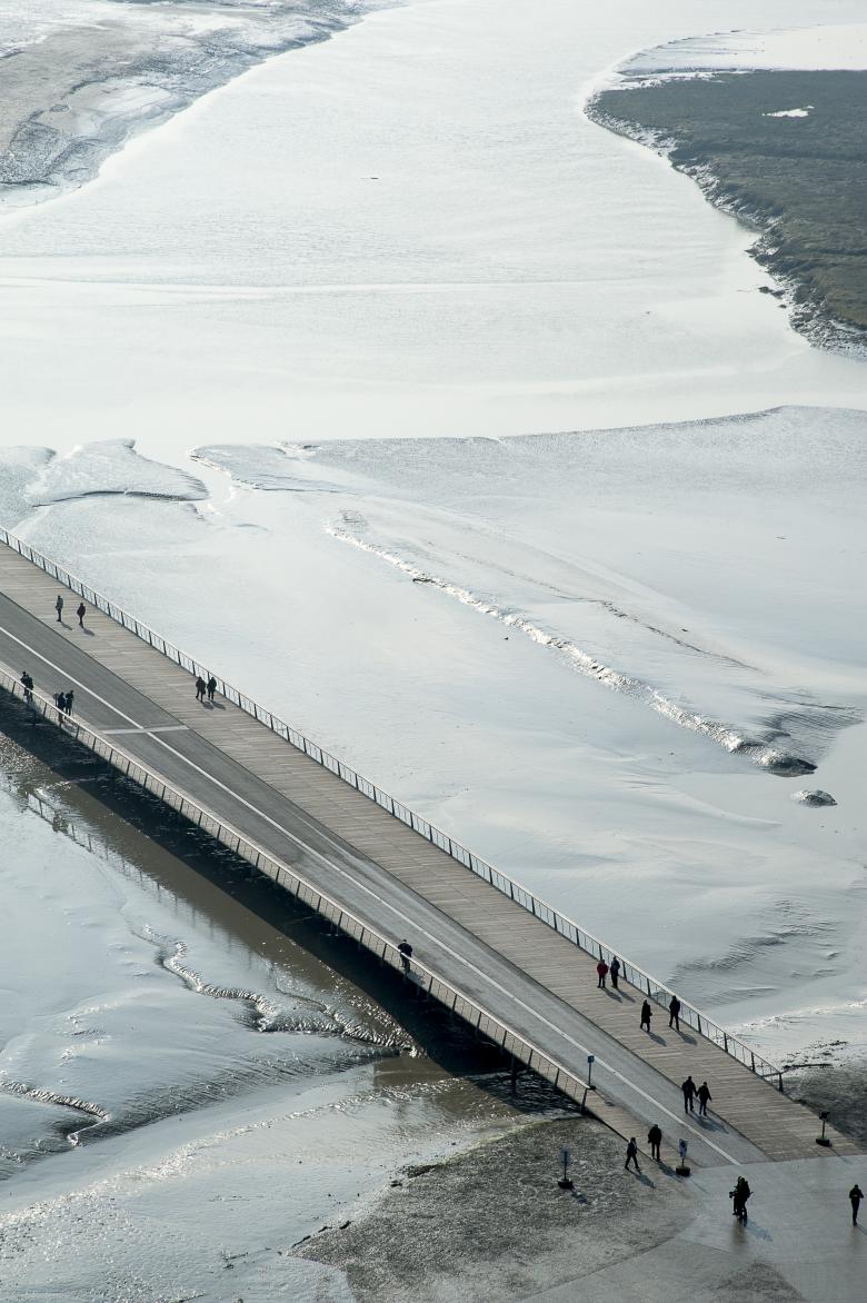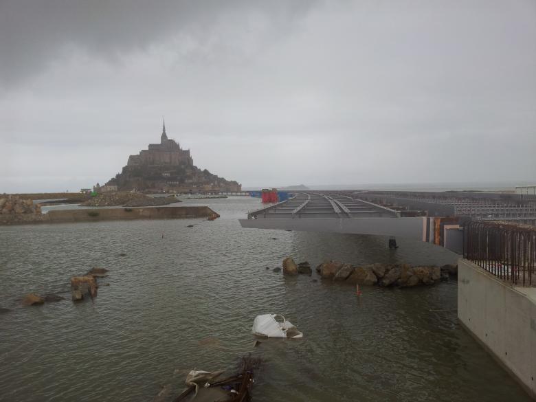 The Couesnon estuary, the bay around Mont Saint Michel, impresses by the immensity of the site, the beauty of light and the colours of the natural elements. Built on a rock in the middle of the bay, the medieval town of Mont Saint Michel topped by its abbey and monastery represents a major cultural landmark and one of France most visited sites. The Mont-Saint-Michel and its bay are part of the Unesco list of World Heritage Sites since 1979. The construction of the roadway (1879) allowed the connection of the Island to the mainland, yet the new sluice obstructed the free course of the sea disconnecting the waters of the river Couesnoon from the bay. The island slowly disappeared. The new 760 meters long jetty replaces the massive roadway and restores the insularity of the Mont-Saint-Michel.