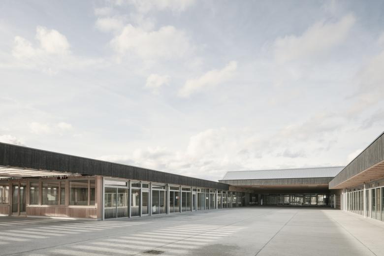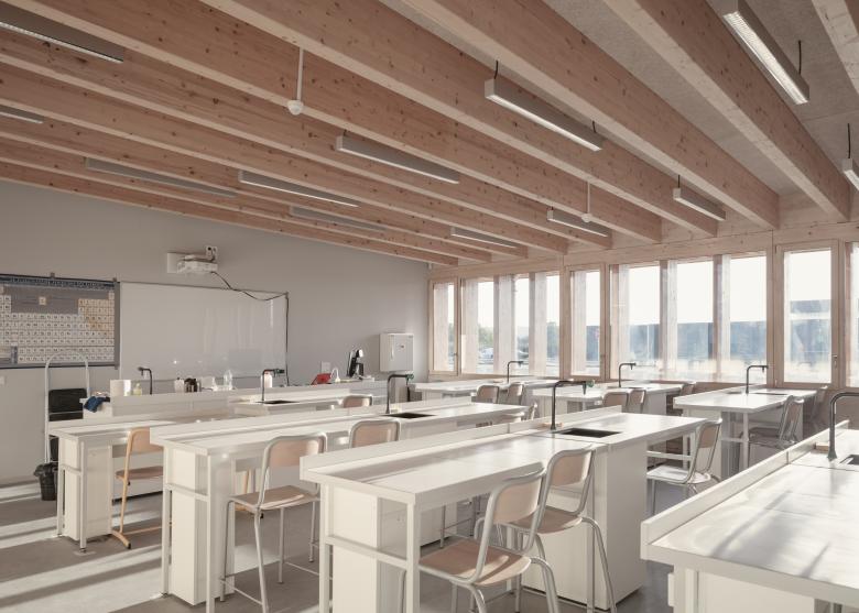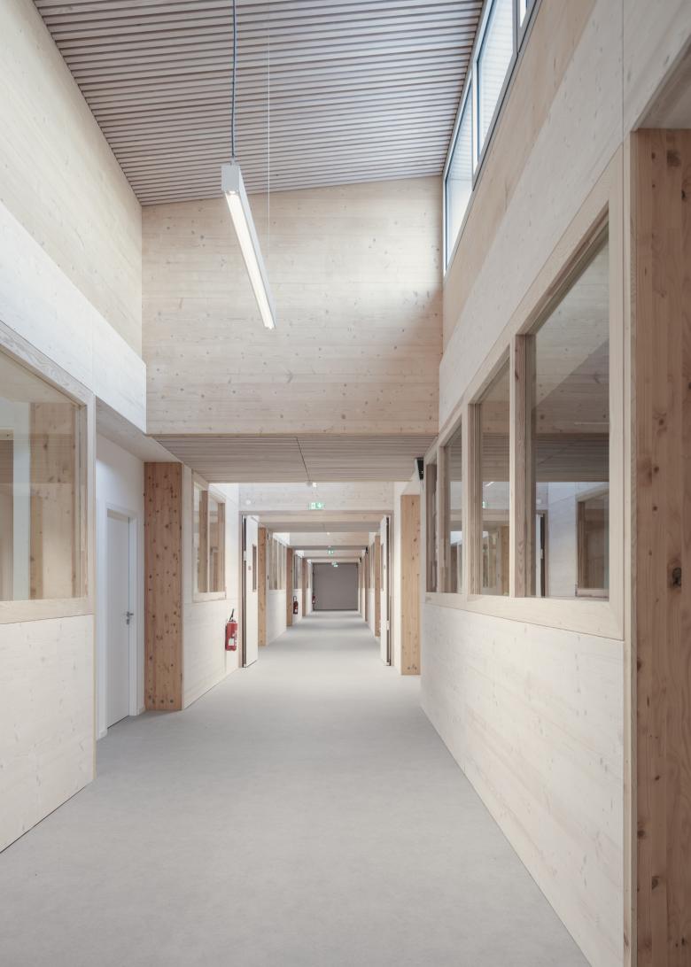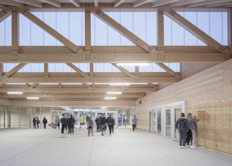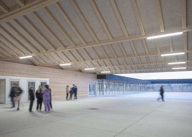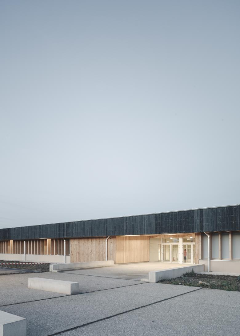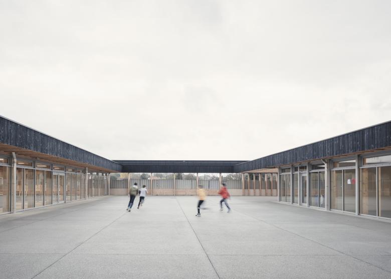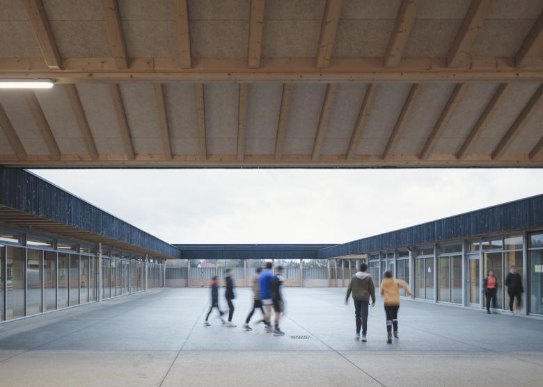 Ein umlaufendes, weit auskragendes Vordach aus dunklem, karbonisierten Holz schützt vor zu starker Sonneneinstrahlung. Dieses Material garantiert Langlebigkeit ohne jegliche Wartung. Die zurückhaltende, geschlossene Gestaltung steht im Kontrast zu den großzügigen, kommunikativen Innenräumen, in denen helles Holz dominiert. Einige Trennwände zwischen den Klassenzimmern wurden aus Lehmziegeln errichtet, um die Akustik und den hygrothermischen Komfort zu verbessern.