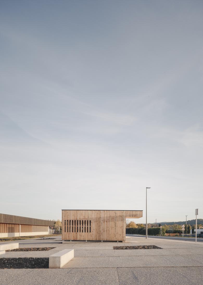 Das Collège am Ortsrand von Bretenoux ist von der Straße etwas abgerückt und definiert mit seiner breiten Westfront einen öffentlichen Platz. Die kompakte Organisation des ebenerdigen Gebäudes erinnert an die mittelalterlichen Landgüter der Region. Der horizontale Monolith ist harmonisch in seine ländliche Umgebung eingebettet und setzt einen urbanen Akzent am Eingang des Ortes.