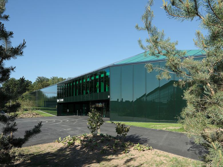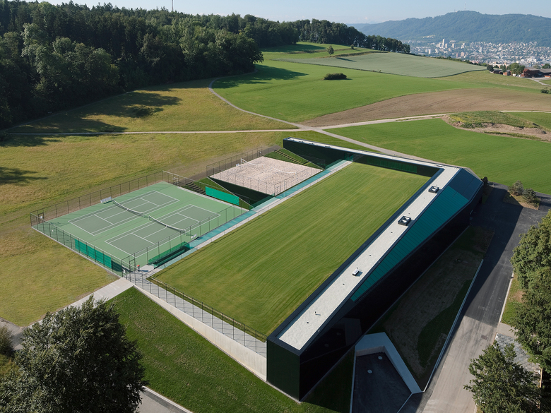 At the eastern edge, where the dense urban development merges into the landscape, the Sports Center blends into the terrain, hiding its true volume in the rising slope. With its beveled edges, it looks flat and adapts to its environment. When facing west to Science City it reveals itself as a glass, crystalline body. The surroundings are reflected in the shimmering greenish glazing, partly transparent and partly with an opaque enamel finish. When viewed from the Käferberg, its sports facilities on the roof make it appear like part of the landscape.