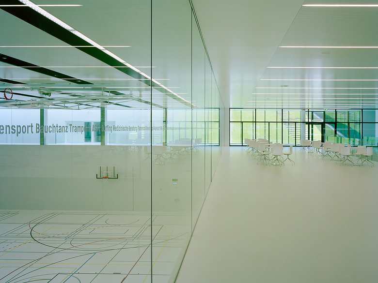 The surprising capacity of the space becomes apparent from the foyer, providing a view out into the depths of the building and leading to the grassy ramps. The access paths, auditorium, changing rooms, exercise rooms and gymnastics halls are all grouped on the different floors around the triple sports hall, which forms the heart of the sports center. The walkways through this spacious structure are clearly organized, the various views and the daylight streaming into the depths help to facilitate orientation. All interior areas are characterized by ethereal airiness and brightness. Subtle and uniform white wall, floor, and ceiling finishes enhance this effect.