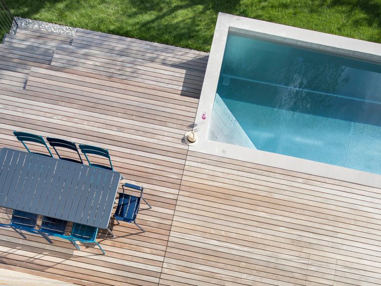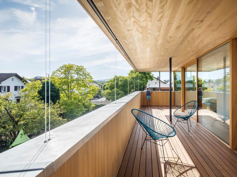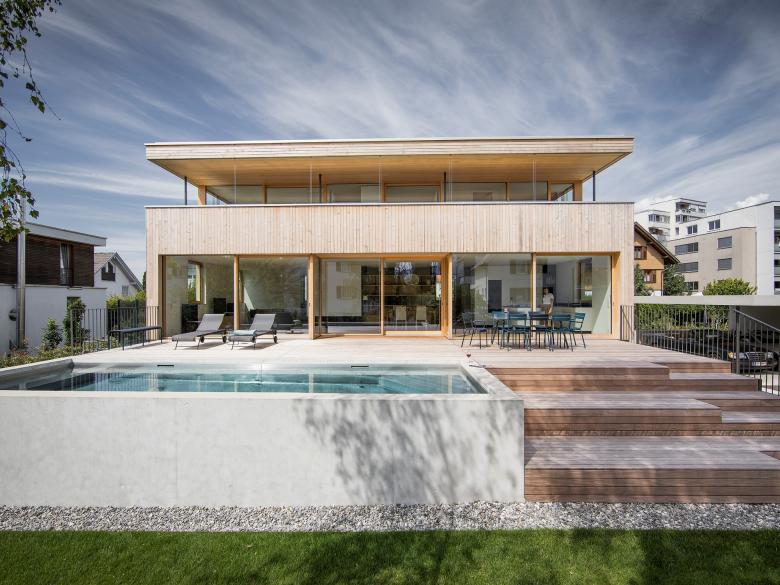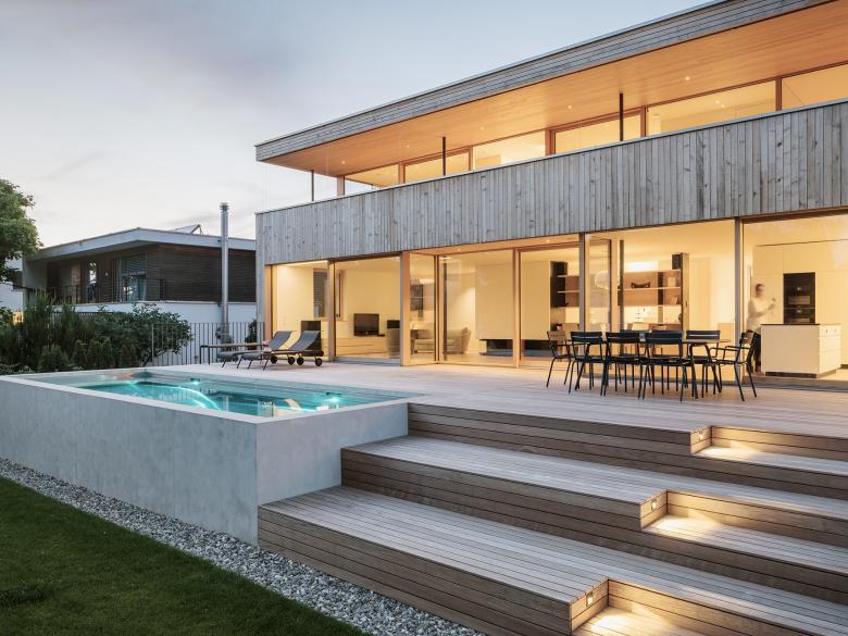 The small window openings in the silver fir façade towards the neighbouring houses only frame specific views. The building opens generously to the south and the garden: room-high sliding doors on the raised ground floor extend the living space to the outside, with direct access to the terrace and an exposed concrete pool. Above, a full-length balcony with a wooden balustrade offers privacy and security to the room-height glazed bedrooms and children’s rooms.