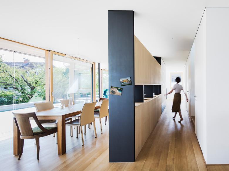 The materialization of the house, characterized by wood, concrete and black steel, is reflected in the interior. The result is a harmonious overall design, an urban oasis of retreat for the whole family.