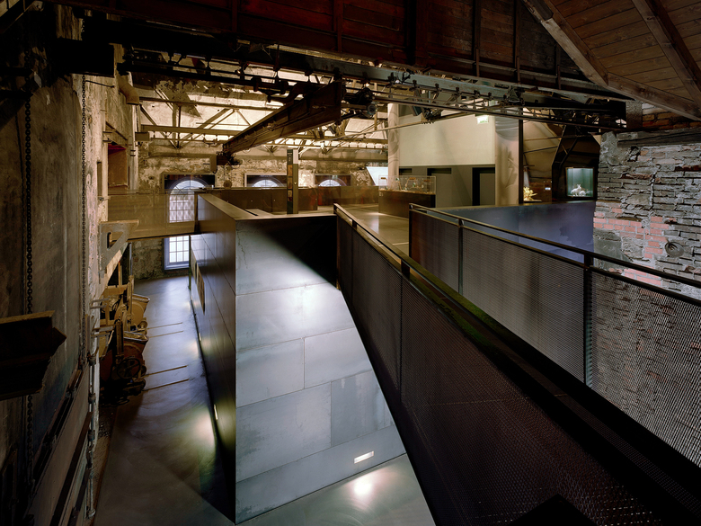 In the former turnery the ticket counter, the café and the museum shop are gathered in a spacious foyer. The round tour on the upper floor begins with a connecting passage at the projection room past the former blast furnaces, which have been preserved as an industrial monument. The two foundries positioned at an angle to each other were completely degutted and extended into the basement. On and below free-standing platforms, a wide array of topics relating to nature and technology are presented.