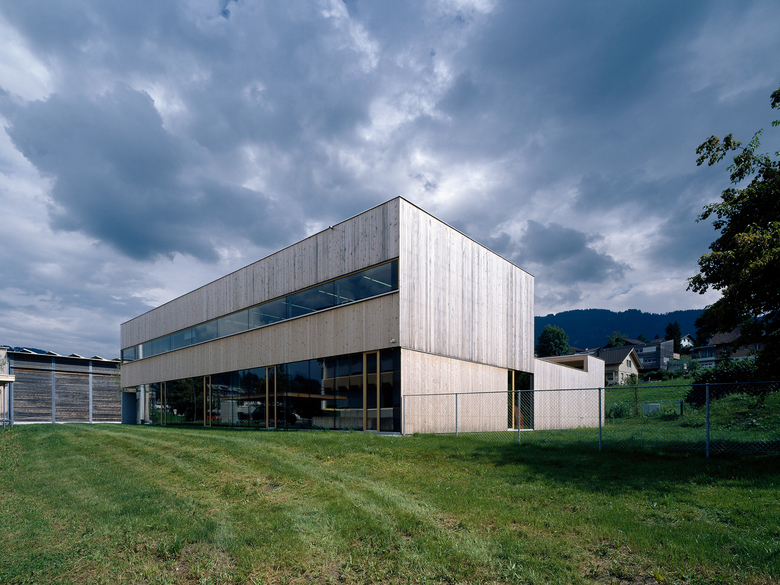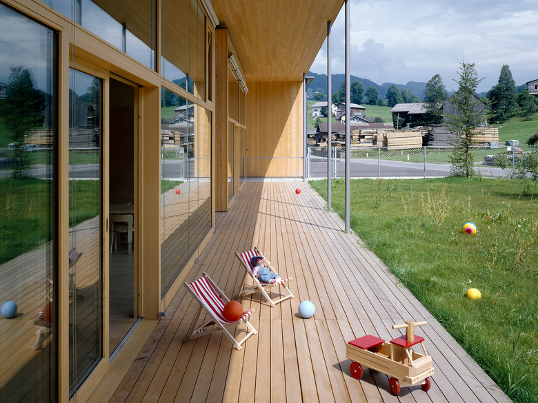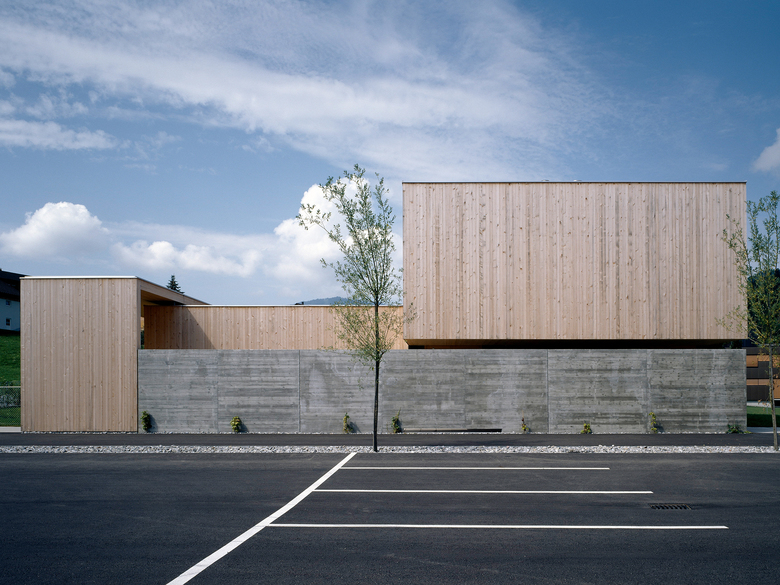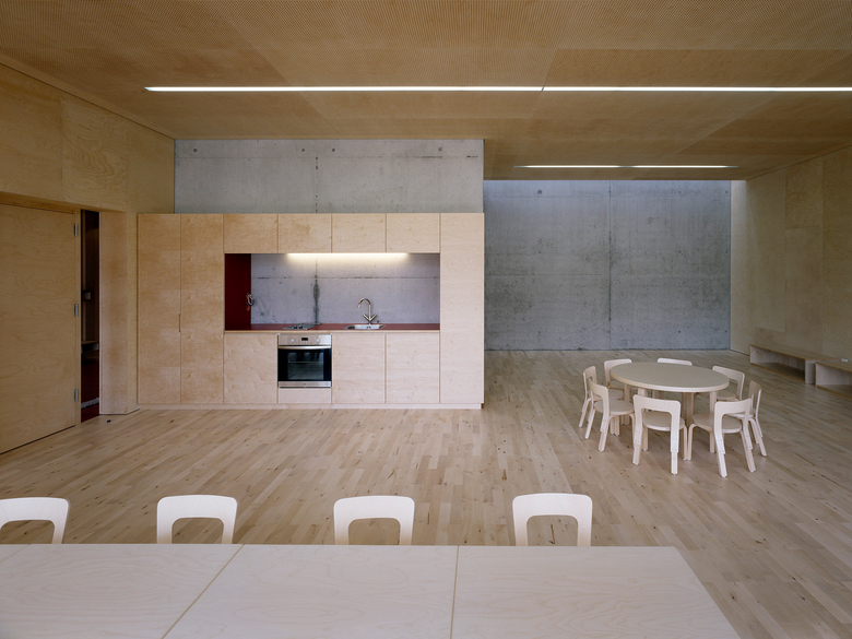 The Kindergarten south of the village center defines the west side of the square. It opens itself to the play garden in the south, while a protecting wall shields the children from the heavy traffic of the parking lot. Two group rooms with dedicated coatrooms are situated along the central corridor of the ground floor. A robust framed construction shades the south-oriented glass façade. Creating a portal, it generously spans the access path and clearly links it to the kindergarten. Situated to the north are adjoining rooms, the office of the head of the kindergarten, a group room and an exercise room. The playrooms are paneled with birch plywood, which creates a warm-colored background for a lively and colorful crowd of children. The upper floor, only about half the size of the ground floor, juts out on the east side over the access path and shields both the entrances. It houses a small lobby and the rehearsal room of the local choir and brass ensemble. The absorption behavior of wall and ceiling elements made of birch plywood has been adapted to specific requirements. The floor has been laid with rough sawn fir wood planks, whose acoustic effect has also been considered. A wide ribbon glazing at the north front lights the room naturally, while preventing heating-up caused by solar radiation.