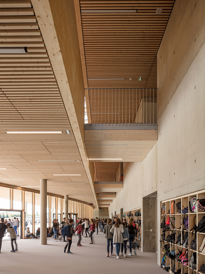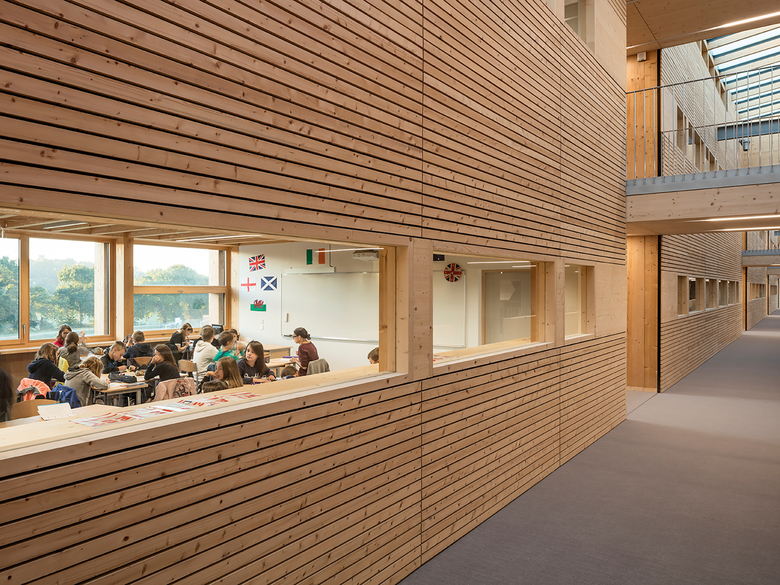 Timber is omnipresent in the design and construction of the building, blending concrete on the ground floor with prefabricated wooden elements on the upper floors. On the southeast and north-west, vertical and horizontal wooden sunshades structure the façade and control the amount of light entering the classrooms. The use of timber also adds to the excellent acoustic performance of the building. The project adopts an environmentally-friendly approach. Untreated local materials help to fit it in with its surroundings and to ensure the durability of the construction.
