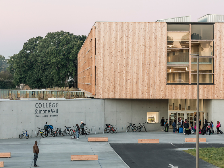 The College in Lamballe is a middle school for over 800 students. Built on a wooded plateau above the town, it consists of two main sections, which differ in their shape and materials: a long timber parallelepiped sits on a base in a gentle curve to echo the site’s topography and blend into the landscape.