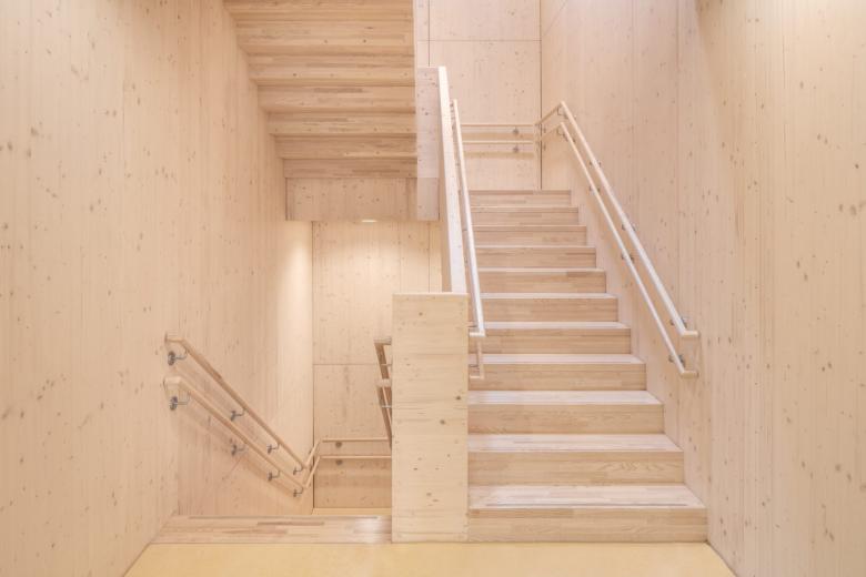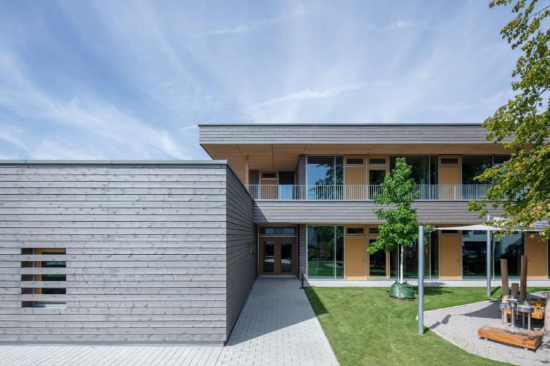 Durch den Abbruch von Wohntrakt und Zwischenbau, den Erhalt und die Sanierung von eingeschossigen Gruppen-Pavillons und den Anbau eines 2-geschossigen, teilunterkellerten Neubautraktes in Holzbauweise wird für die 4-gruppige Kita Pezzettino mit heilpädagogischem Angebot ein neues Gebäude-Ensemble geschaffen. Die Anmutung der neuen Kita wird geprägt von horizontalen Holzschalungen, Attika- und Brüstungsbändern, dem Wechselspiel von transparenten und geschlossenen Bauteilen sowie einer abwechslungsreichen Ausformung unterschiedlicher Höhen und plastisch ausgebildeten Gebäudevor- und Rücksprüngen, die von den umlaufenden Fluchtbalkonen ergänzt werden.