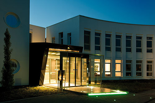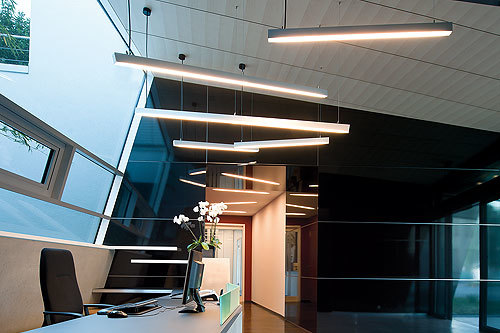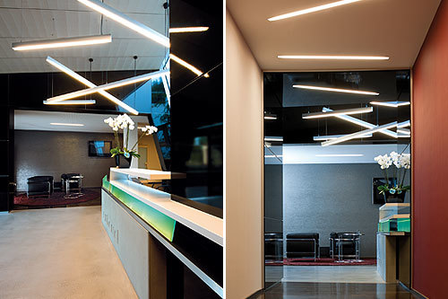 Expressiv in Form, Farbe und Material stellt sich der neue Eingangsbereich der Firma Orthomol dar. Das auf das Konzept abgestimmte Licht leitet den Besucher im Außenbereich über bodennahe Lichter in das Foyer. Lichtlinien in freier Schrägstellung wirken wie ein in den Raum gehangenes Mobile. Dieser Rhythmus wird in den Flurbereichen deckenbündig weitergeführt. Neben den gestalterischen Aspekten, stand auch der Einsatz von energieeffizienten Leuchtmitteln im Fokus.