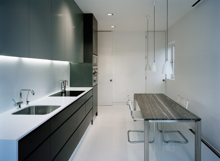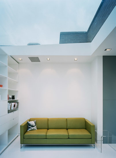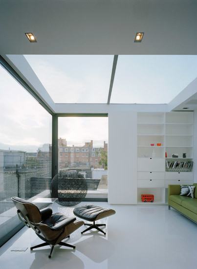 Our proposal was, to extend by building over an existing terrace. Two large sliding doors open into cavities within the walls so that on a good day one can still enjoy the open air.