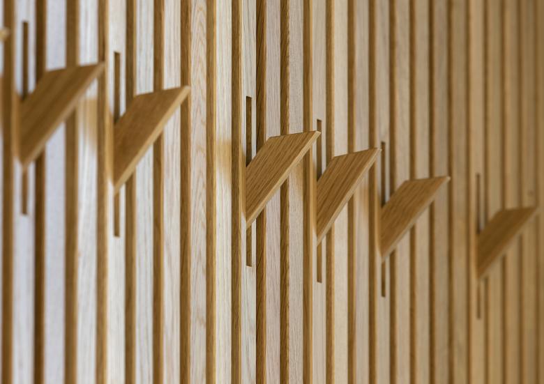 Von der Decke aus leuchten große, dünne LED Leuchten in Kreisform den Raum aus. Die verschiedenen Fachbereiche haben jeweils ein eigenes gestaltetes Symbol erhalten. Die Metalltechnik ist beispielsweise an einem großen Zahnrad zu erkennen.