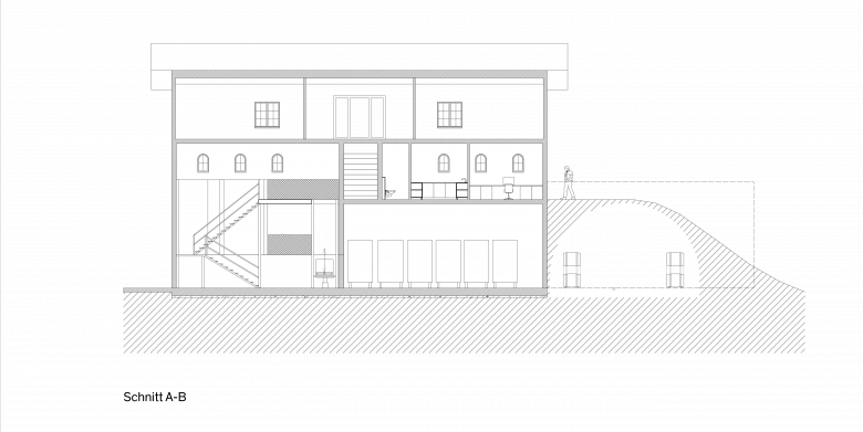 Anders als bei den Räumen im Erdgeschoss des Gebäudes, wo sich Aspekte wie Klimatik und Raumaufteilung an den Personen, die diese Räume nutzen orientieren, liegt im Keller der Fokus auf dem Wein und seinem Reifungsprozess. Die erforderlichen Temperaturen und Feuchtigkeit soll der Philosophie der Bauherren entsprechend, möglichst von natürlicher Herkunft sein.
