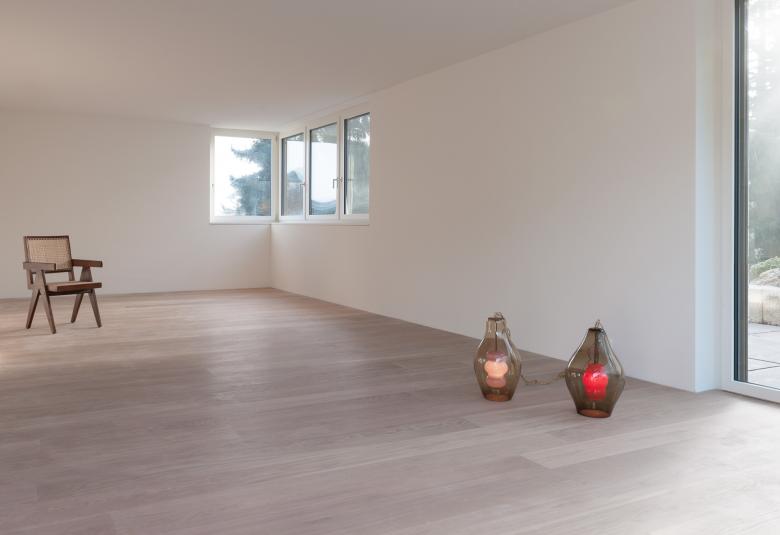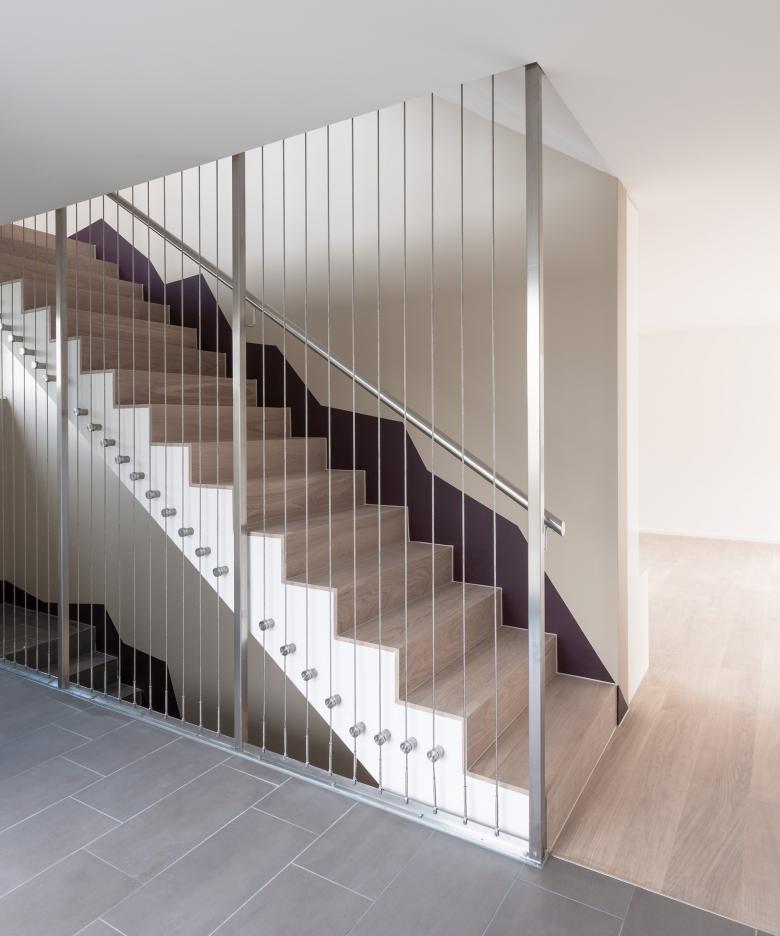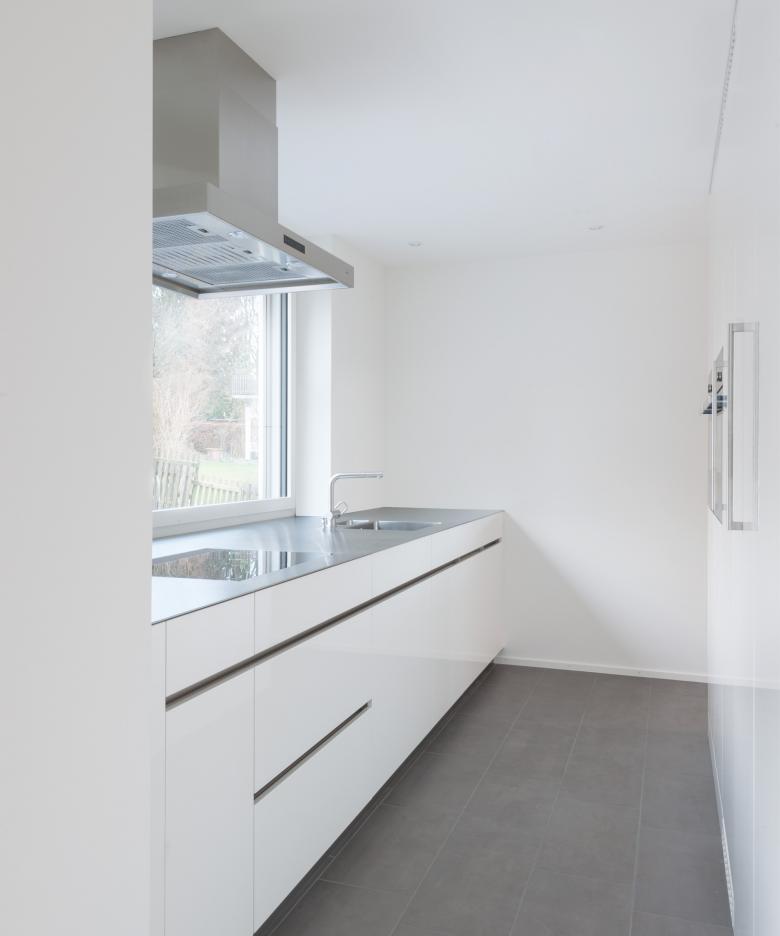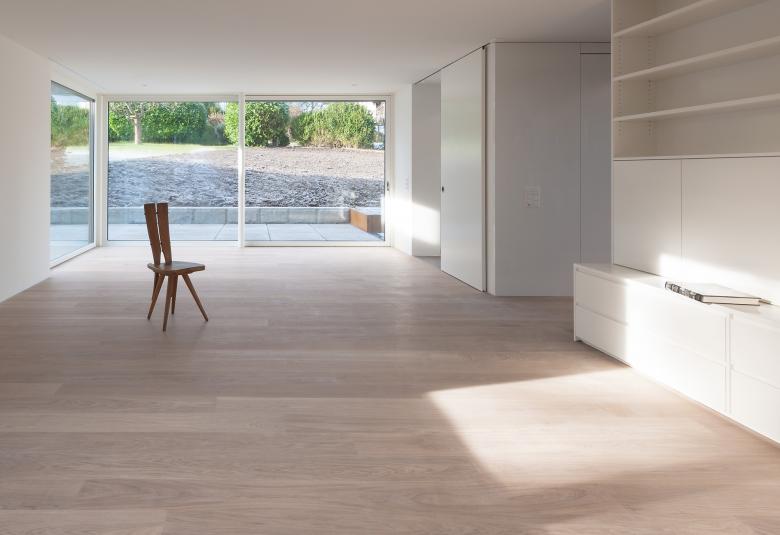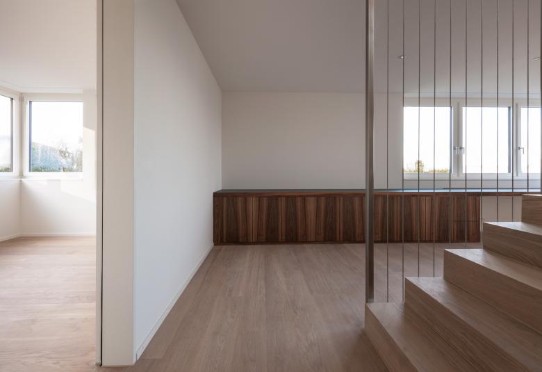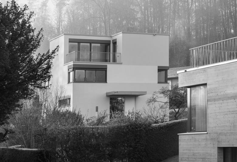 Die Gestaltung des Hauses entstand aufgrund des definierten Budgets, das die Grösse bestimmte und wegen der örtlichen Situation, die, die attraktiven Ausblicke auf den See und nicht auf die umliegenden Häuser, bewusst nutzte. Das in die Höhe gebaute, viergeschossige Volumen, das im Grundriss praktisch quadratisch erscheint, weist ausgeprägte Eckfenster auf. Der Grundriss ist wirtschaftlich und zeigt wenig Erschliessungsfläche. Zudem sind alle Schlafzimmer gleich gross und damit gleich wertig. Die grundrissliche Typologie dafür ist das Windrad, das eine strukturierte und klare Grundrissorganisation aufweist: Die Räume sind in die Ecken platziert und die Zirkulationszonen können für weitere Tätigkeiten wie Arbeiten genutzt werden. Die Fassade sollte die Funktion der inneren Räume nach aussen zum Ausdruck bringen. Deshalb gibt es wenige, jedoch gleiche Fenstertypen: Eck-, Band- sowie Hebeschiebefenster. Um die Fassade zu gliedern, wurde diese an bestimmten Stellen bänderartig, in einer gröberen und dunkleren Putzstruktur gefertigt. Innen wurden überall pflegeleichte Materialien wie Eichenparkett und Keramikplatten für die Böden sowie Weissputz für die Wände und Decken verwendet.