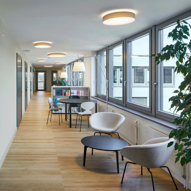 Vom Pflegeheim zum smarten Office: nach einem großzügigen Rückbau konnte das vierte Obergeschoss eines ehemaligen Alten- und Pflegeheims optimal an die Bedürfnisse des neuen Mieters angepasst und in eine elegante Bürolandschaft transformiert werden.