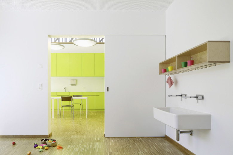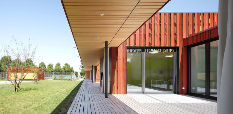 Variance procedure 2010, 1st place: The new nursery for three groups was created nestled between the tennis court and the protected shore zone. The wooden structure that is based on the design of a single-storey club house was erected within two weeks from prefabricated elements.