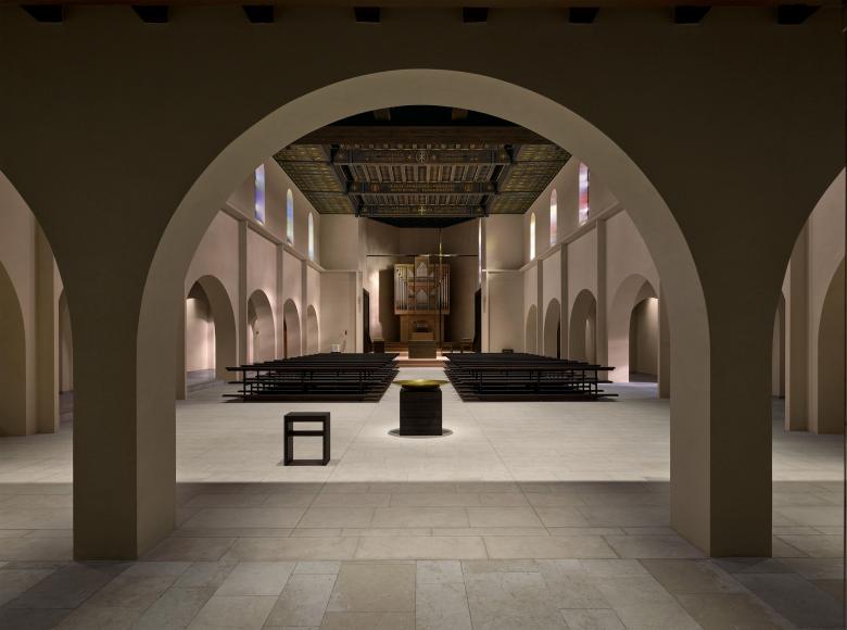 Der Innenraum der Kirche St. Franz Xaver hat eine bewegte 87-jährige Geschichte. 1932 als Wegekirche eingeweiht, wurde sie 1974 in eine profane Arenakirche umgewandelt. Erst 2019 konnte dem Kirchenraum im Rahmen der Gesamtsanierung wieder seine axiale Ausrichtung und die ihm gebührende Stimmung als Sakralraum zurückgegeben werden. Mit der Umgestaltung wurden die vorhandenen Qualitäten, die Typologie der Wegekirche und die Wertigkeit der verwendeten Materialien hervorgeholt. Die neue Inszenierung und räumliche Gliederung schaffen vom Eingang bis hin zum Altarraum eine zunehmende atmosphärische Dichte und Heiligkeit. Der hintere Bereich des Hauptschiffs wurde von den Kirchenbänken befreit und nur mit einem neuen Taufbecken, als Ort der Taufe, möbliert. Die beiden dunkel gebeizten Bankfelder setzen im Hauptschiff einen gewollten Akzent auf dem hellen Kalksteinboden und nehmen Bezug zur Kassettendecke. Der Altarraum in Verlängerung des Chorraums ist zwei Stufen erhöht im Hauptschiff verortet. Die entwickelte Altarmöblierung mit dem neu interpretierten Chorgestühl und dem raumaufspannenden, kunstgeschmiedeten Kreuz unterstützt und schärft das räumliche Konzept des Sakralraums. Gestaltung und Liturgie sind wieder in Einklang mit der Form und Geometrie einer Wegekirche. Die gewählte Farbgebung und Lichtführung ist zurückhaltend und spielt primär mit hell-dunkel Kontrasten, sowie Braun- und warmen Grautönen. Damit wird die Schlichtheit der Kirche unterstrichen und zugleich die dekorative Kassettendecke und die farbigen Kirchenfenster mit ihrer sakralen Wirkung betont. Die akustisch wirksame Rhythmisierung und Überlagerung der Längswände mit Lisenen und einem Fries strecken die gedrungenen Rundbögen, verorten die zu hochliegenden Fenster und schaffen im Übergang von Hauptschiff zu Chorraum eine subtile räumliche Trennung. Der Kirchenraum lädt die Menschen wieder zum Eintreten, Innehalten und Feiern ein.