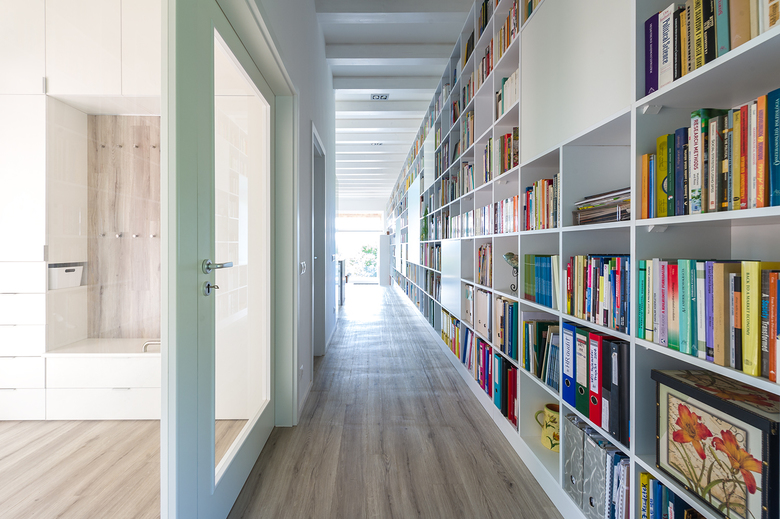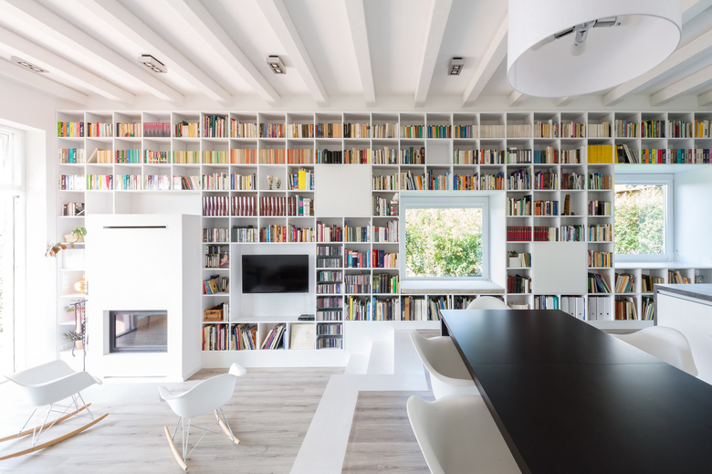 The giant bookshelf fulfils much more functions than one would expect. Throughout its 17 meters the modular system architects designed opens up, enabling a window to perfectly fit in, and a window seat – thanks to the 50 cm deep walls. At the living room the shelves are united with the fireplace.