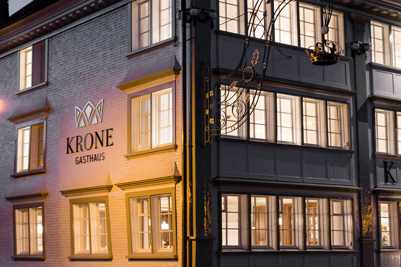 überdauerte nur die Haupteingangstüre und ein Nussbaumgeländer mit Kreuzbogenmotiv. Diese Reminiszenz bildete sodann der Aufhänger für gestalterische Motive, die sich in Schnitzereien – in Anlehnung an die Weissküferei – in den Bettrückwänden und Buffets finden, in Paravents, im Gittertor oder in der Magnetwand, in der Signaletik bis hin zum Logo des Gasthauses. Dieses wiederum bildet die Grundlage für das CIKonzept.