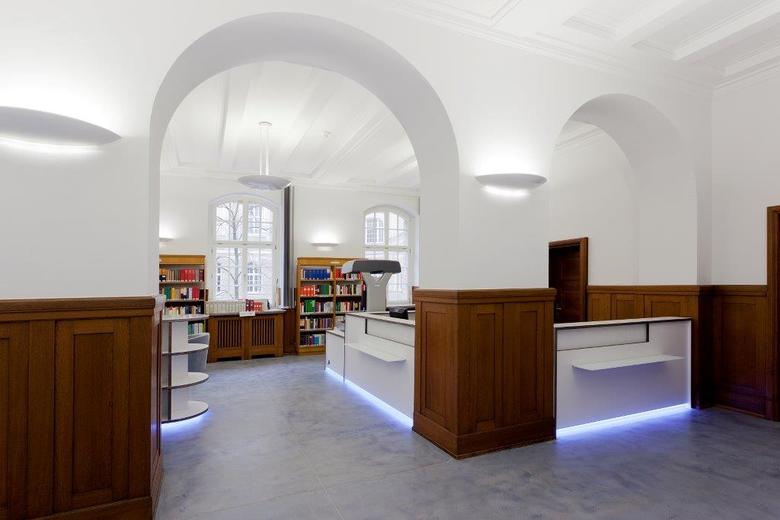 Integriert... – Die historische Bibliothek im denkmalgeschützten Gebäude des Oberlandesgerichts Köln am Reichenspergerplatz erstrahlt nach einer Renovierung im neuen Glanz.