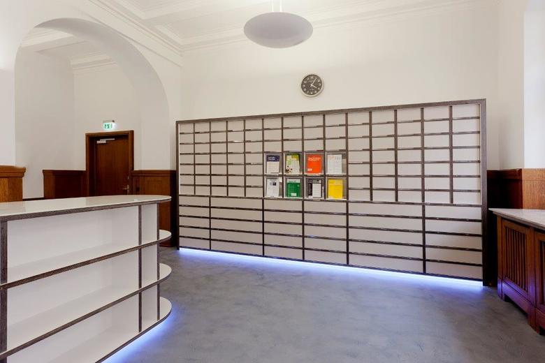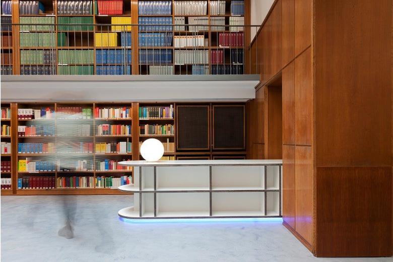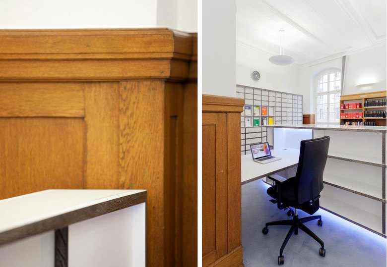 Materialitäten werden von alt ehrwürdigen Wandvertäfelungen in Detailaus-bildungen adaptiert, variiert und in einen zeitgemäßen, kontrastierenden Kontext gesetzt. So findet sich beispielsweise Linoleum in Schrankfronten wieder, welche inspiriert wurden durch Schreibeinlagen in historischen Lese- und Arbeitstischen.