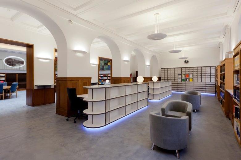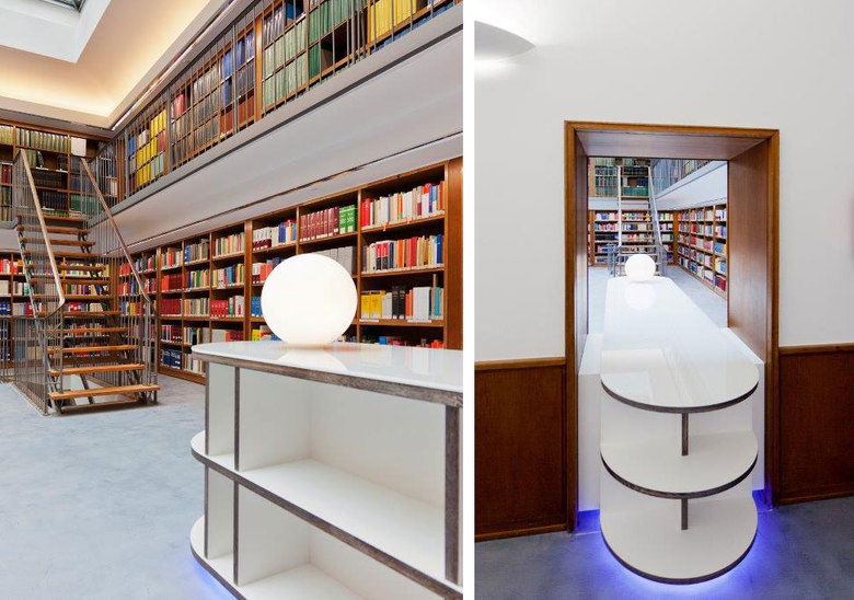 Ausgehend davon, dass die denkmalgeschützte Bibliothek über zwei Räume verfügt, die durch eine Flurzone unterbrochen werden, zeichnet sich der Entwurf besonders dadurch aus, dass die hinzugefügten raumbildenden Ausbauten, Glaskuppel-Saal über den Flur hinweg mit dem neuen Lese-Loungebereich und Empfangszone gestalterisch verbinden. Side- und Highboardelemente als zusätzlicher Stauraum für Bücher, schaffen Übergänge und gliedern ver-schiedene Funktionsbereiche, die dem Nutzer unterschiedliche Aufenthalts- und Arbeitsqualitäten anbieten.