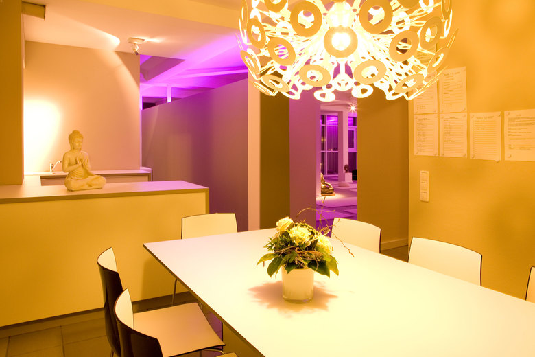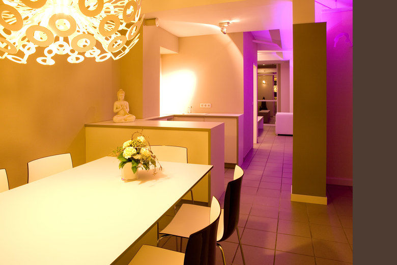Ziel der Planungsaufgabe war die Vergrößerung und Umgestaltung des YOGA-Studios Angelika Fraikin zu einem einzigartigen, atmosphärischen Ort der Ruhe, Entspannung und Meditation. Yoga-Raum und Nebenräume werden durch eine raumbildende, freistehende Wandscheibe mit integrierter Beleuchtung und paneelartigen Filzelementen voneinander getrennt. Farbe, Material und Licht als wichtigste Bestandteile dieser Innenarchitektur lassen die Bereiche ineinander fließen und harmonisieren. Lichtstimmungen können durch modernste LED-Lichttechnik gesteuert und bereichsweise variiert werden.