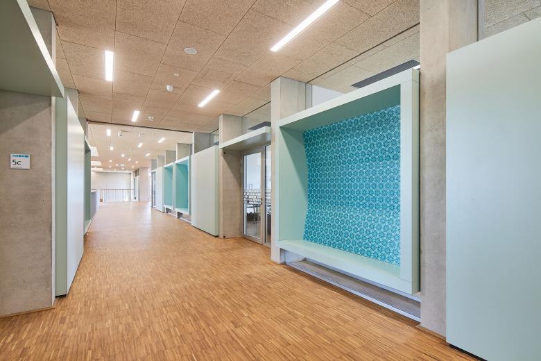 Immer der Farbe nach – Damit in dem weitläufigen Gebäude für eine gute Orientierung gesorgt ist, entwickelten wir gemeinsam mit Kriso Leinfellner/Visuelle Kultur KG ein optisches Leitsystem, mit dem jede Klasse eine ganz eigene visuelle Adresse erhält. Als Leitfarbe zieht sich Seegrün durch die Innenräume, jedem Stockwerk ist zusätzlich eine eigene Signalfarbe – rot, grün, oder blau – zugeordnet. Je nach Lage gibt es für jeden Klassen-Cluster außerdem ein eigenes Muster. Dieses findet sich etwa auf Glasflächen oder den Sitznischen wieder, die wie multifunktionale Raummöbel die Klassen von den Gangbereichen trennen. Auf den Rückseiten dieser Elemente ist in den Unterrichtsräumen jede Menge Stauraum untergebracht.
