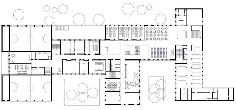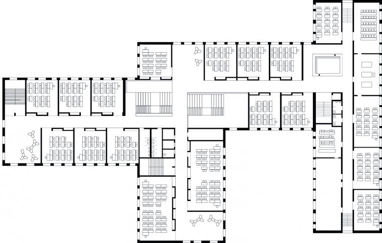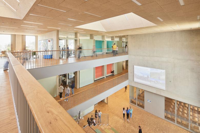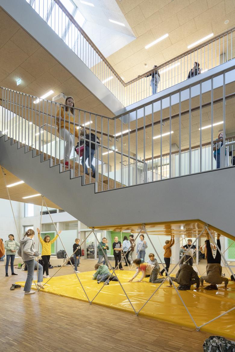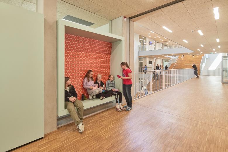 Von den offenen Bereichen wie der Aula und dem ebenfalls neu gestalteten Foyer ausgehend sind die Klassen räumlich in Clustern zusammengefasst. In zusätzlichen Pausen- und Bewegungszonen gibt es für die SchülerInnen gemütliche Sitzmöbel oder Kletterstangen zum Herumkraxeln.