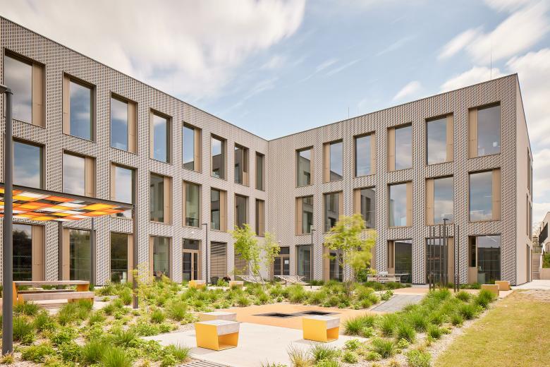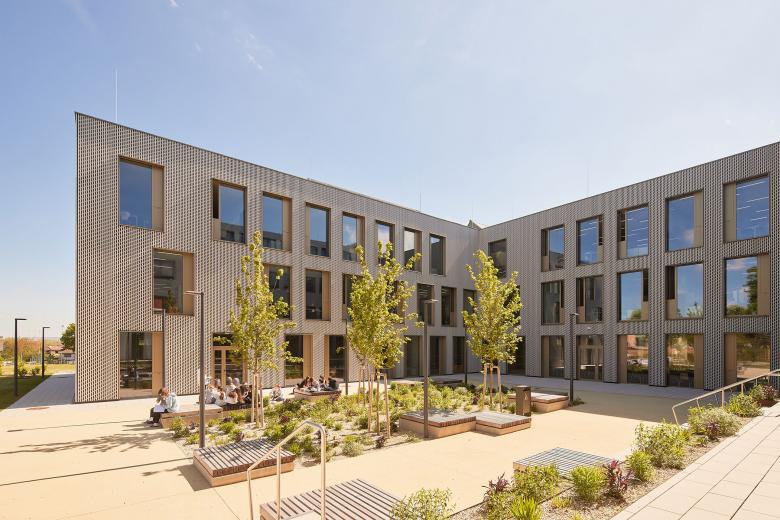Großzügiger Freibereich – Von den raumhohen Fenstern in den Klassenzimmern aus haben die SchülerInnen einen Blick in die Schulhöfe und den großzügig gestalteten Schulgarten. Die Freibereiche sind ebenso wie die Innenräume alles andere als eintönig gestaltet: Mit unterschiedlichen Möbeln und einem Wechsel aus strukturierten Plätzen und naturnahen Flächen gibt es hier viel Platz zum Entspannen, Bewegen, Spielen und kreativen Lernen.