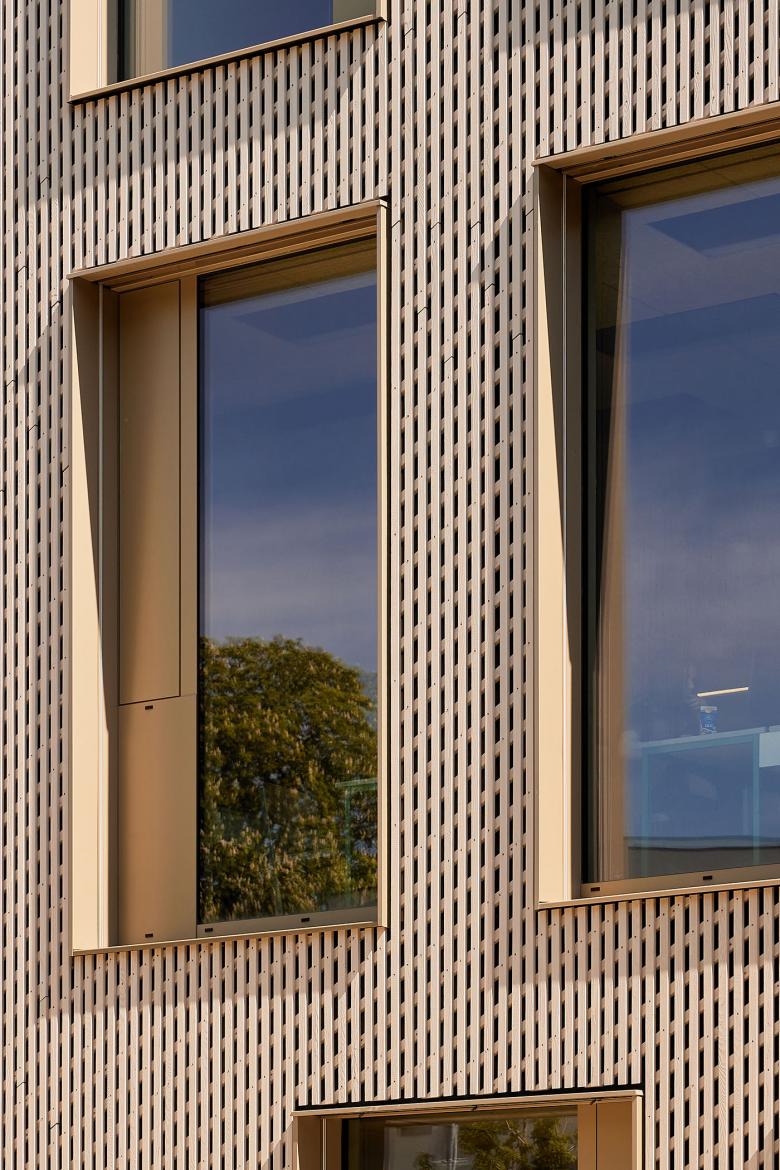 Natürliche Leichtigkeit – Mit dem neuen Zubau erhielt das Gymnasium auch ein neues, charakteristisches Äußeres. Die feingliedrige Holzlamellenfassade verleiht dem Gebäude Leichtigkeit und Dynamik. Die aus heimischer Lärche gefertigten, diagonal und vertikal angeordneten Latten erhalten durch den Einfluss der Witterung im Lauf der Zeit eine wunderschöne, silbrig-graue Patina.