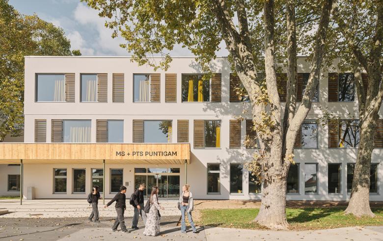 Zwischen der Mittelschule und dem Bestandsturnsaal entstand der Zubau für das neue Polytechnikum ebenso in Holzleichtbau. Mit Um- und Neubau gibt es nun Platz für 350 Schüler:innen in 14 Klassen. Die großen Fenster der Mittelschule und die Holzlattenfassade der Polytechnischen Schule knüpfen gestalterisch an die Fassade der Volksschule an. Mit dem gemeinsamen Schulgarten wächst der Puntigamer Bildungscampus nun auch räumlich zusammen.