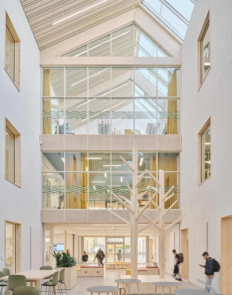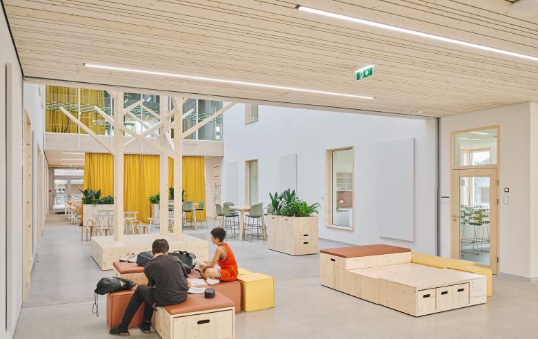 Die zwei Baumskulpturen aus Holz geben dem großen Raum Maßstab und sind eine riesige dreidimensionale Pinwand. Mit der angrenzenden Nachmittagsbetreuung, den Lehrwerkstätten, der Garderobe, Bibliothek und der Direktion ist die Aula der zentrale Treffpunkt für die Mittelschule.