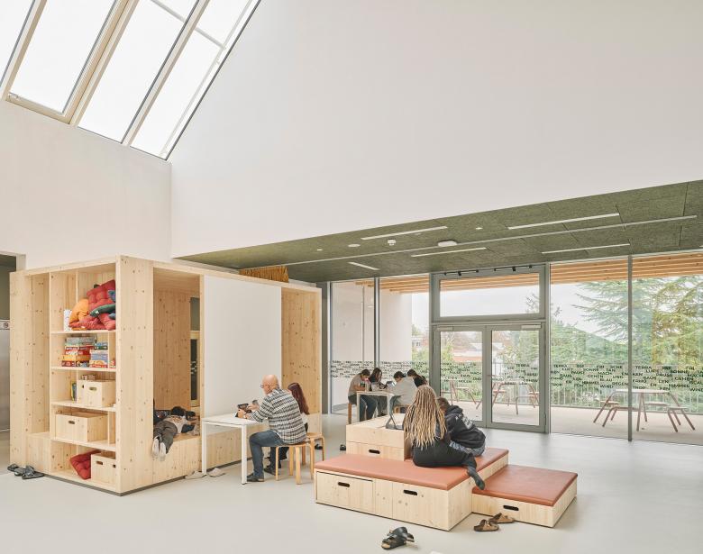 Die beiden bestehenden Klassentrakte stockten wir in Holzleichtbau auf und verbanden sie mit Holzplattformen zu vier Lernclustern. Diese teilen sich jeweils Gruppenräume, Loggien sowie zentrale Lern- und Pausenbereiche. Hochwertige, vielseitig nutzbare Möbel schaffen in den Clustern einzigartige Lernorte. Mit den Holzboxen und ein paar Vorhängen sowie den abwechslungsreichen Räumen, die darum herum entstehen, bekommen die Jugendlichen vielfältige Orte zur Aneignung. Die Fotos von David Schreyer zeigen es, sie sind nötig und sie werden genutzt.