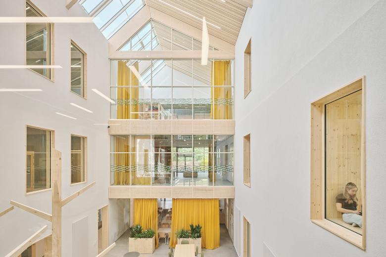 „Der Umbau der alten, dunklen Fünfzigerjahre-Schule muss mindestens genauso gut werden, wie unser Volksschul-Neubau daneben“, war der Anspruch, den wir an das Projekt setzten. Der Befreiungsschlag war schließlich, die beiden bestehenden Klassentrakte aufzustocken, den viel zu engen, dunklen Innenhof dazwischen zu entkernen und mit einem Sheddach zu schließen. So entstand die wunderbar lichtdurchflutete, dreigeschoßige Aula, die dem Haus ihren großzügigen Werkstattcharakter gibt.