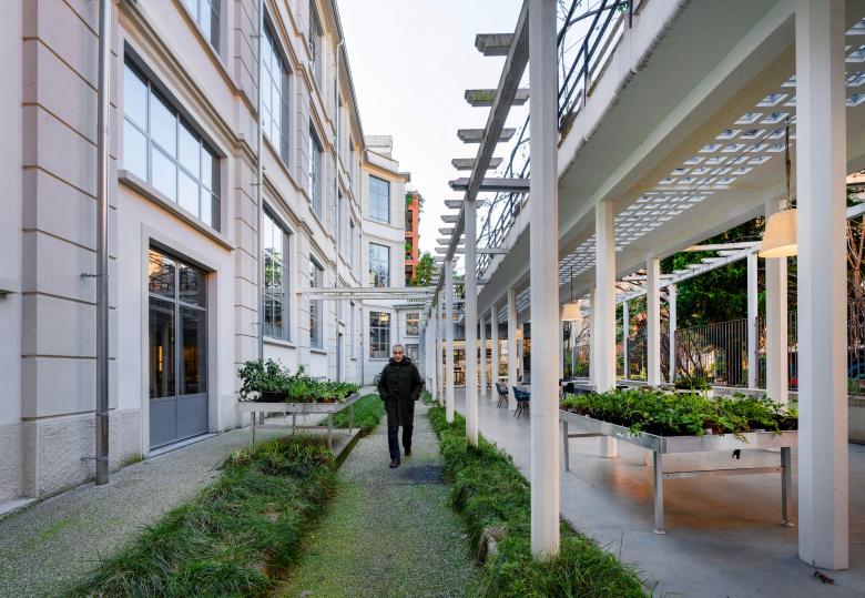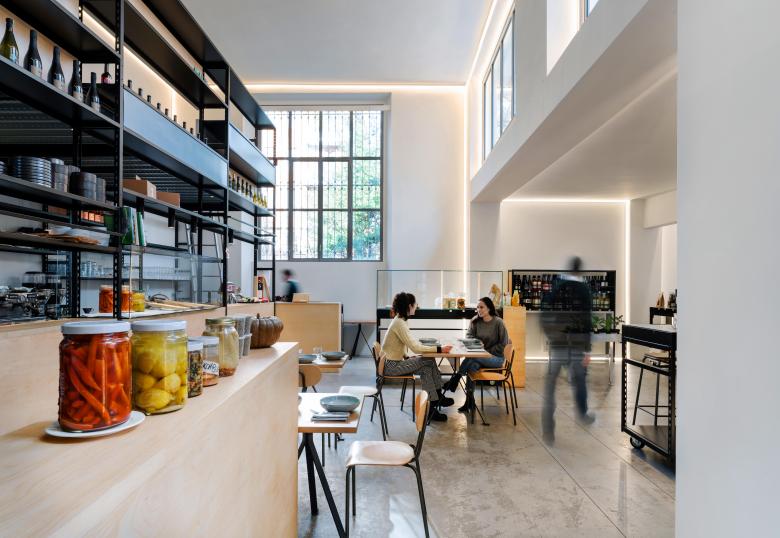 Il bar costituisce il cuore pulsante della “Casa”, luogo di incontro, filtro di accesso al magnifico giardino, elemento di riferimento per il pubblico e focolare domestico dei suoi abitanti. Qui la “ gabbia strutturale” genera due volumi, uno basso e largo ed uno snello che si inseriscono nello spazio esistente in punta di piedi per generare una matrice formale dalla pelle camaleontica, calda ed animata. Infatti su diversi livelli si alterneranno persone, bottiglie, prodotti, casse, bicchieri, reti metalliche e piani in legno in un dinamico patchwork di texture e colori che varia con le stagioni e i suoi prodotti.