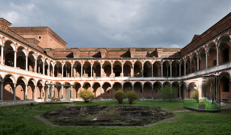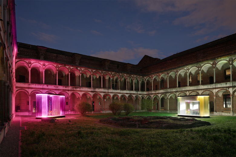 The installation consists of two glass structures or “cells” with antithetical formal characteristics, which establish a visual dialogue by placing themselves at opposite corners of the courtyard. They represent the two complementary spirits of the healthcare of the future: on one hand, the focus on transforming the hospital into a domestic space, on the other hand, the advent of the “virtual healthcare” and consequent “dehospitalization”.