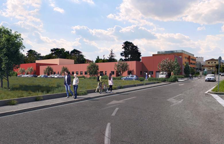 E’ stato costruito in soli 3 mesi e mezzo con metodo fast track (in cui la costruzione va di pari passo con la progettazione) ed è costituito da diversi moduli che si sviluppano in una composizione di volumi policromi proporzionata e dinamica, in dialogo con la clinica esistente. Il colore delle facciate intonacate si ispira al rivestimento in cotto dell’adiacente clinica: ogni volume del complesso è interpretato con sfumature della stessa gamma cromatica.