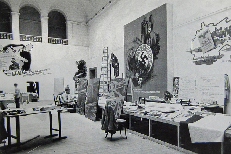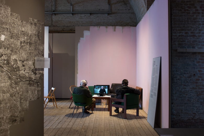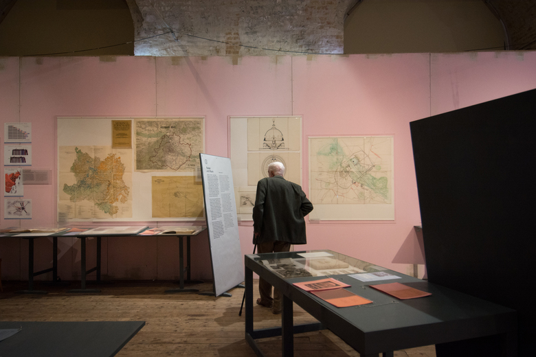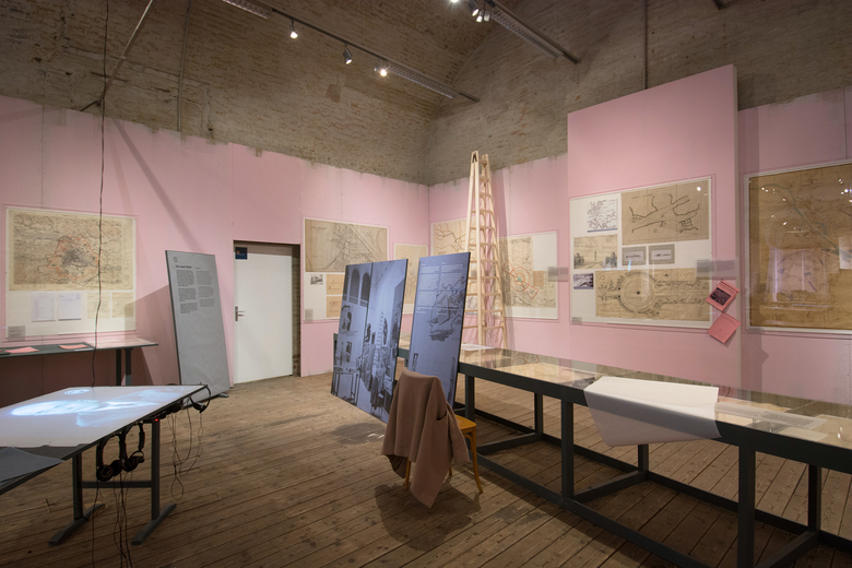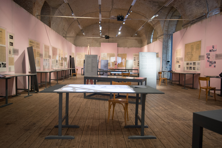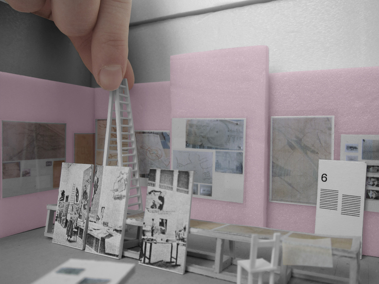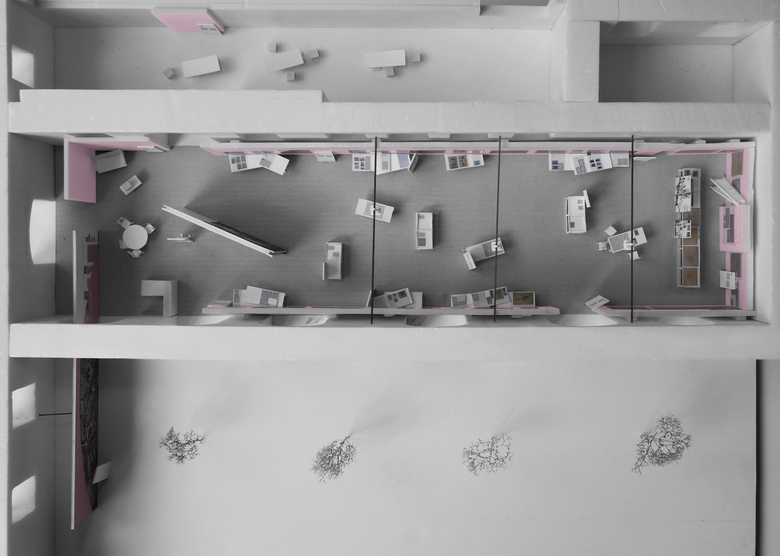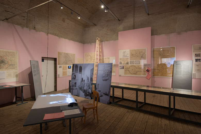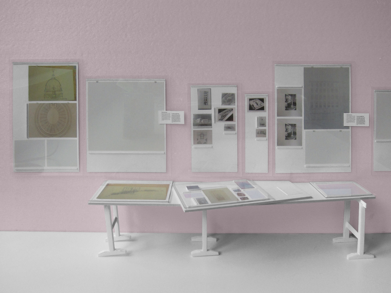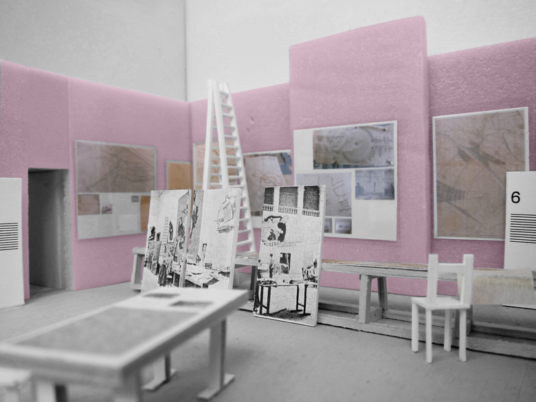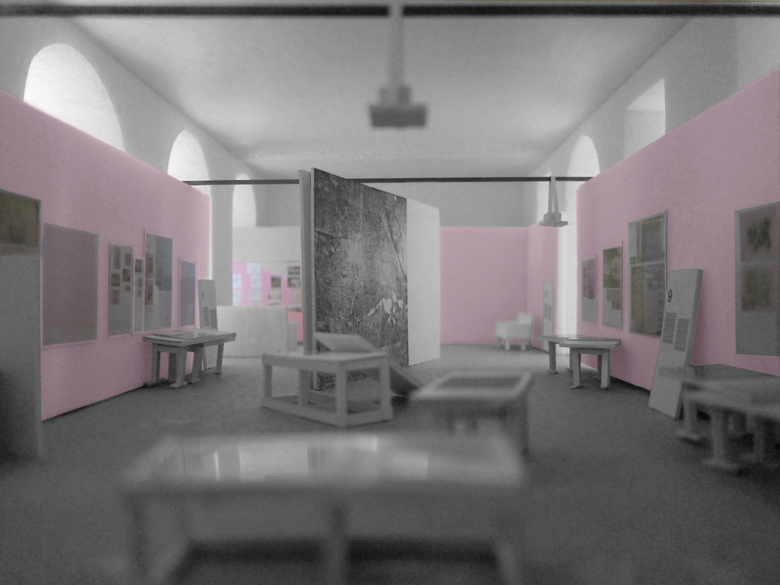 A photograph from 1946 is the reference point for the exhibition design – a “re-enactment” of this picture – at Architekturzentrum Vienna. The reference shows the installation of the exhibition “Never Forget! An Antifascist Exhibition”, and was taken at the Künstlerhaus Wien in 1946. Our design concept for the exhibition at Az W in 2015, an exhibition of the Klaus Steiner Archive to be shown for the first time: of an archive of urban and regional plans of National- Socialist Vienna, is based on this moment of installation in 1946. The design is a re-enactment of an unfinished situation: Seven decades after the end of the Nazi regime, a start is only now being made to process the history of urban and spatial planning in Nazi Vienna, as well as of the history of the lack of awareness of the depth of architecture´s involvement with Nazism, as well as of visible, and invisible, continuities in urban planning and development. The history of violence that many of these plans result into — “Aryanisation”, forced labour, expulsion and organised mass murder — is not captured in the original documents on display. This, too, is reason for the “reconstruction” of an unfinished moment: unfinished — and yet still clearly with a distinctive positioning. The walls of the 1946 exhibition “Never Forget!” were definitely not painted pink; yet we use this color in the exhibition because it would have been anathema to the Nazis, and counteracts the sense of appropriation into the present time. An exhibition of first allusions in mid-installation.
