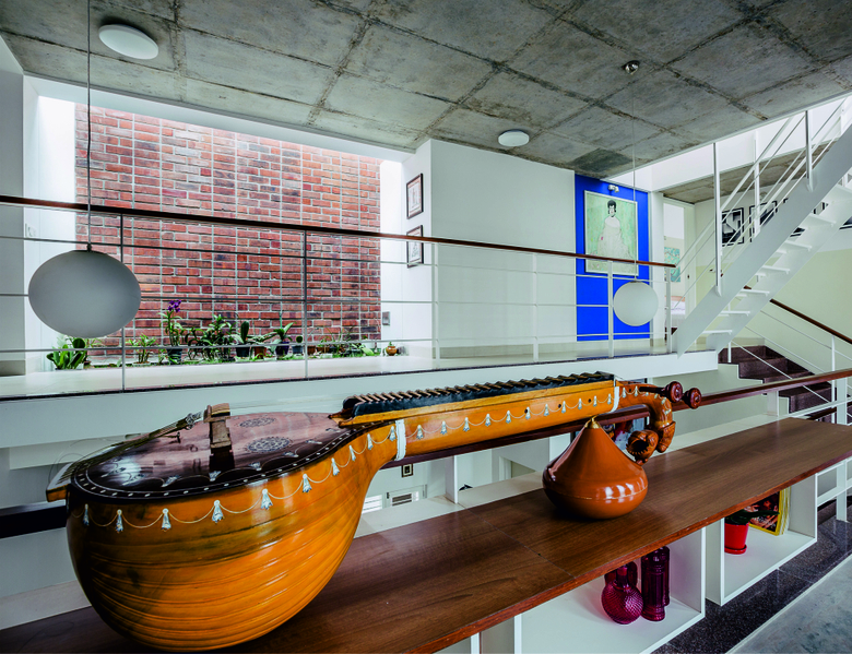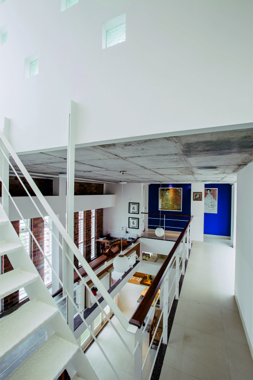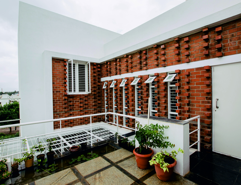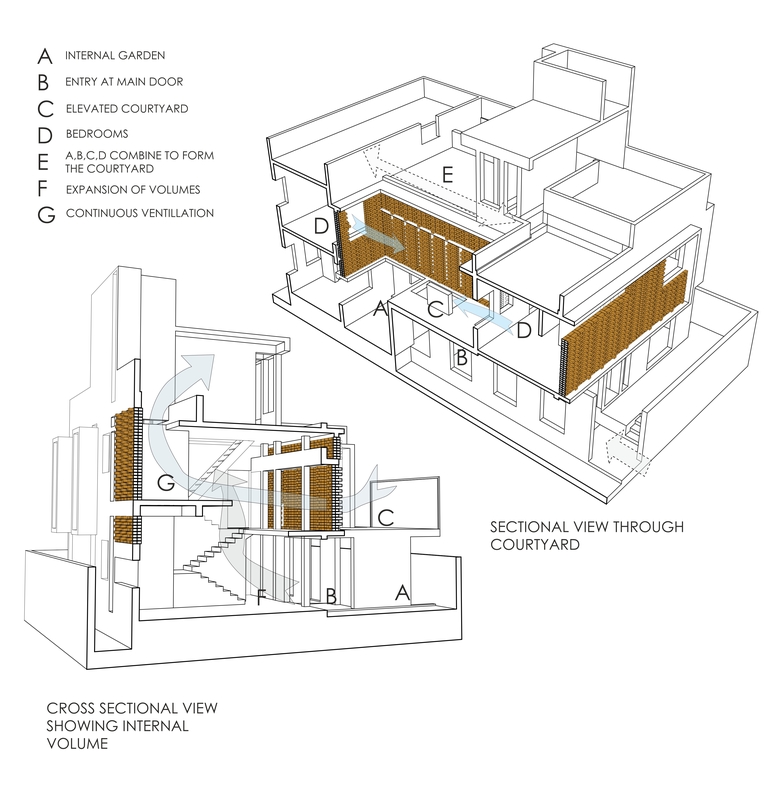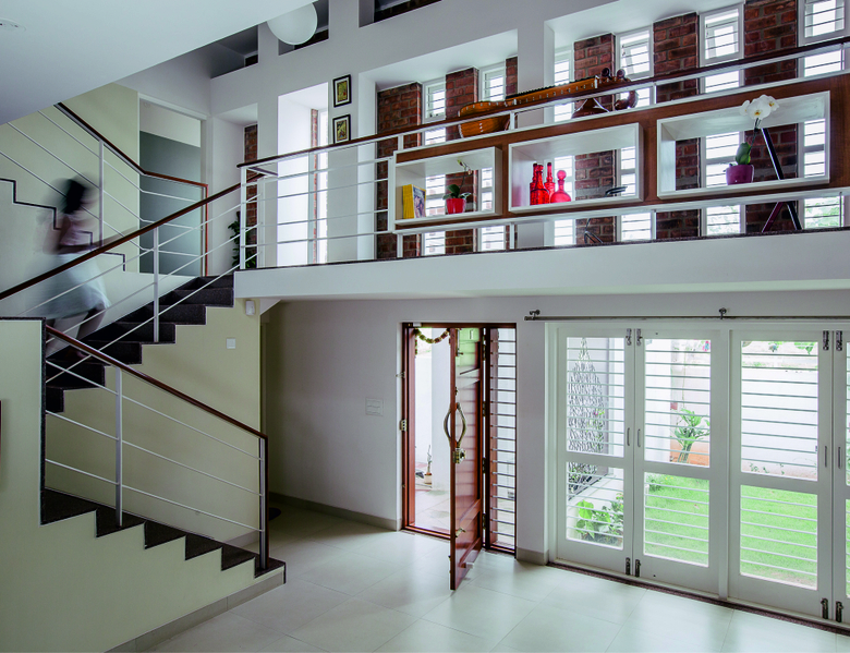 Height has been used as a privacy element and the staircase as an element of dramatic transformation. The brick facades on the elevations and courtyard express the house's subtle relationship with the outside, as the projecting bricks cast varying shadows each day peculiar to that moment.