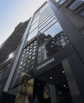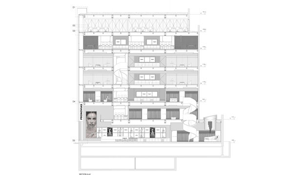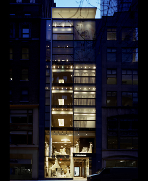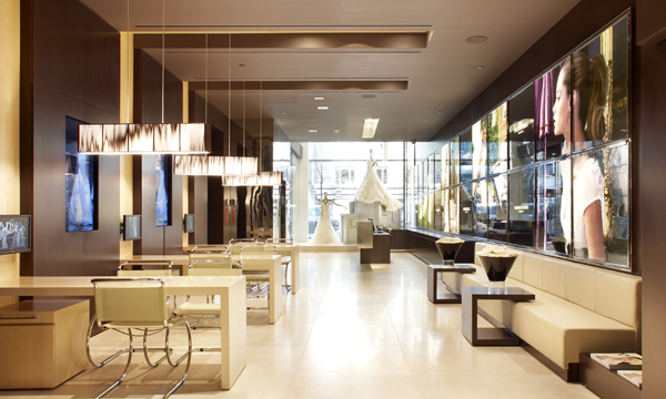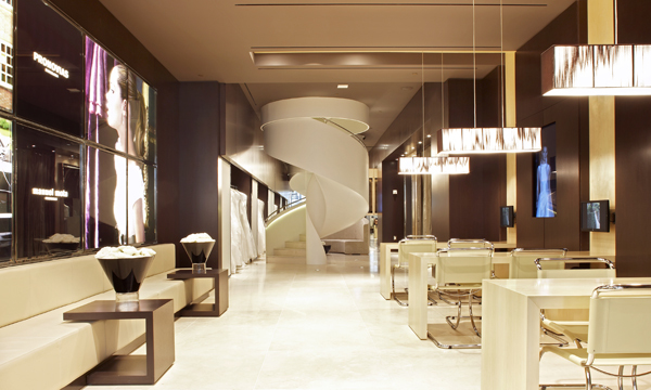 New construction of building in New York. Spread over seven floors in Manhattan, the New York branch of Pronovias contains the main retail center, showroom, and offices for the Barcelona based company. A premier retailer of wedding gowns, the class and sophistication of the brand is reflected in all aspects of the architecture, from the materials, to the finishes, to the lighting.