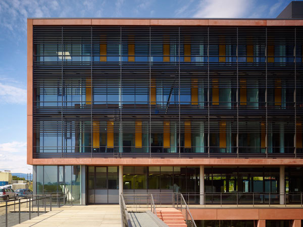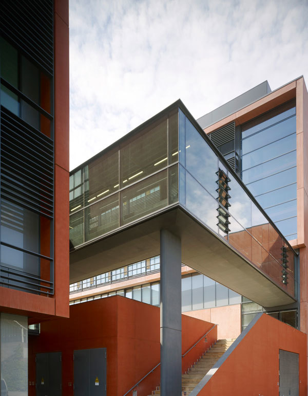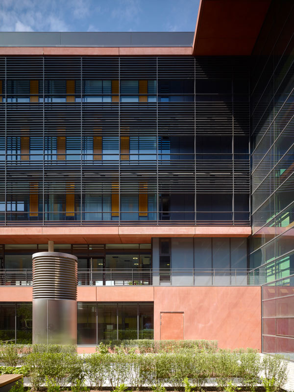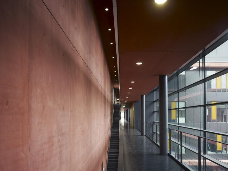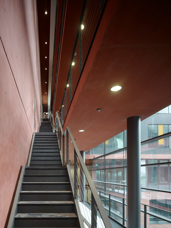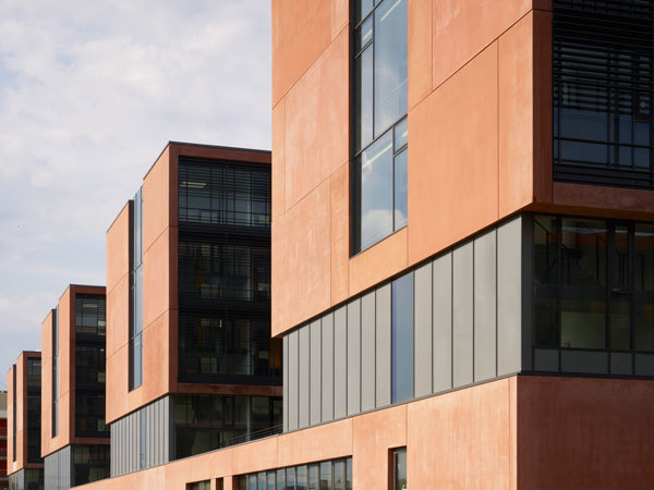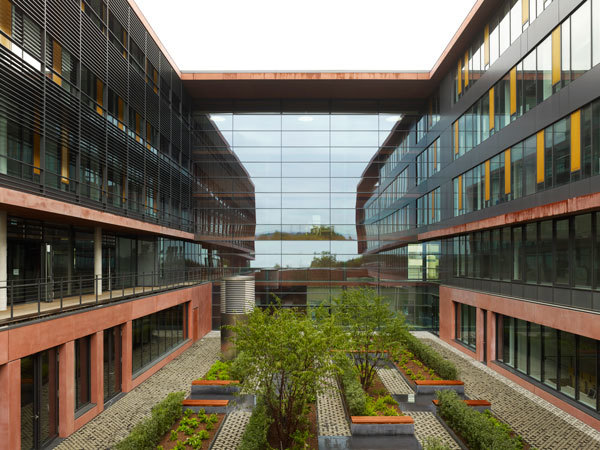 The new building is divided into four parallel tracts, which are connected to the north-south running glazed main circulation axis. Transparent one-storey lateral tracts allow for an intimate courtyard situation, while at the same time the view towards the Taunus mountain range can still be experienced. A lightweight roof in the north connects the Biologicum to the neighbouring MPI and marks the main entrance. Apart from the completely glazed access zones large-sized closed elements characterize the façades. This way the glass proportion is less than 40 percent thus meeting today’s ecologic energetic requirements.