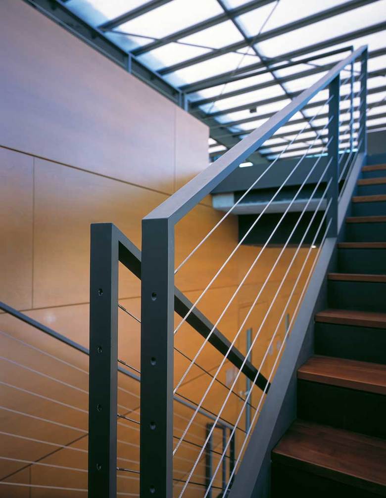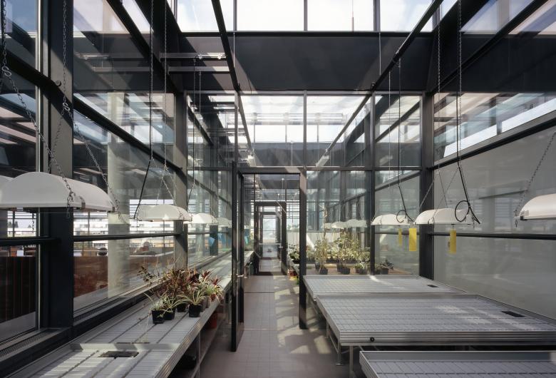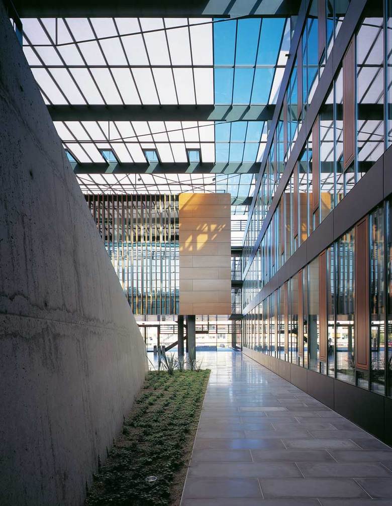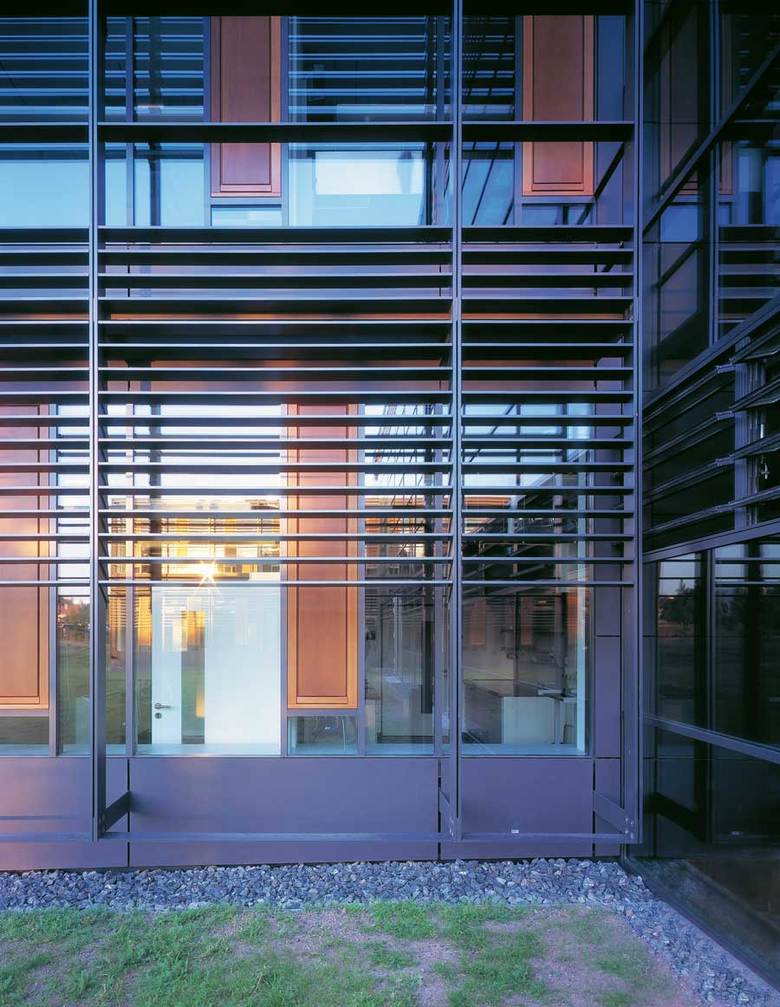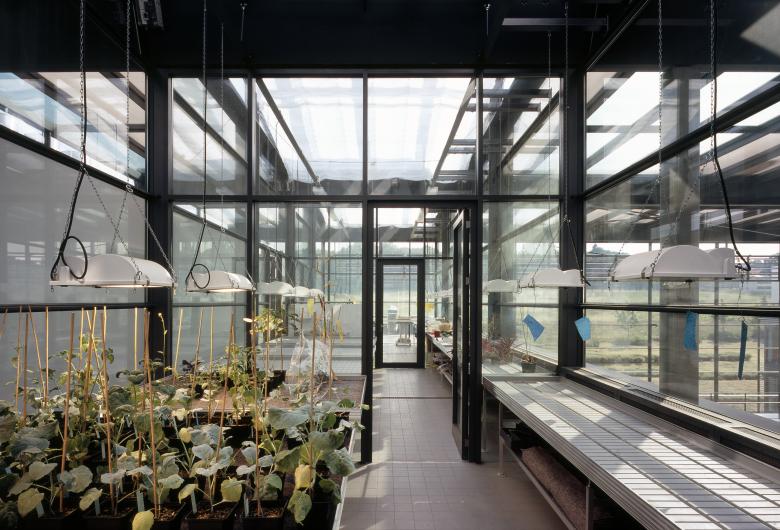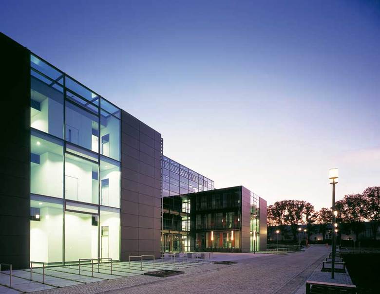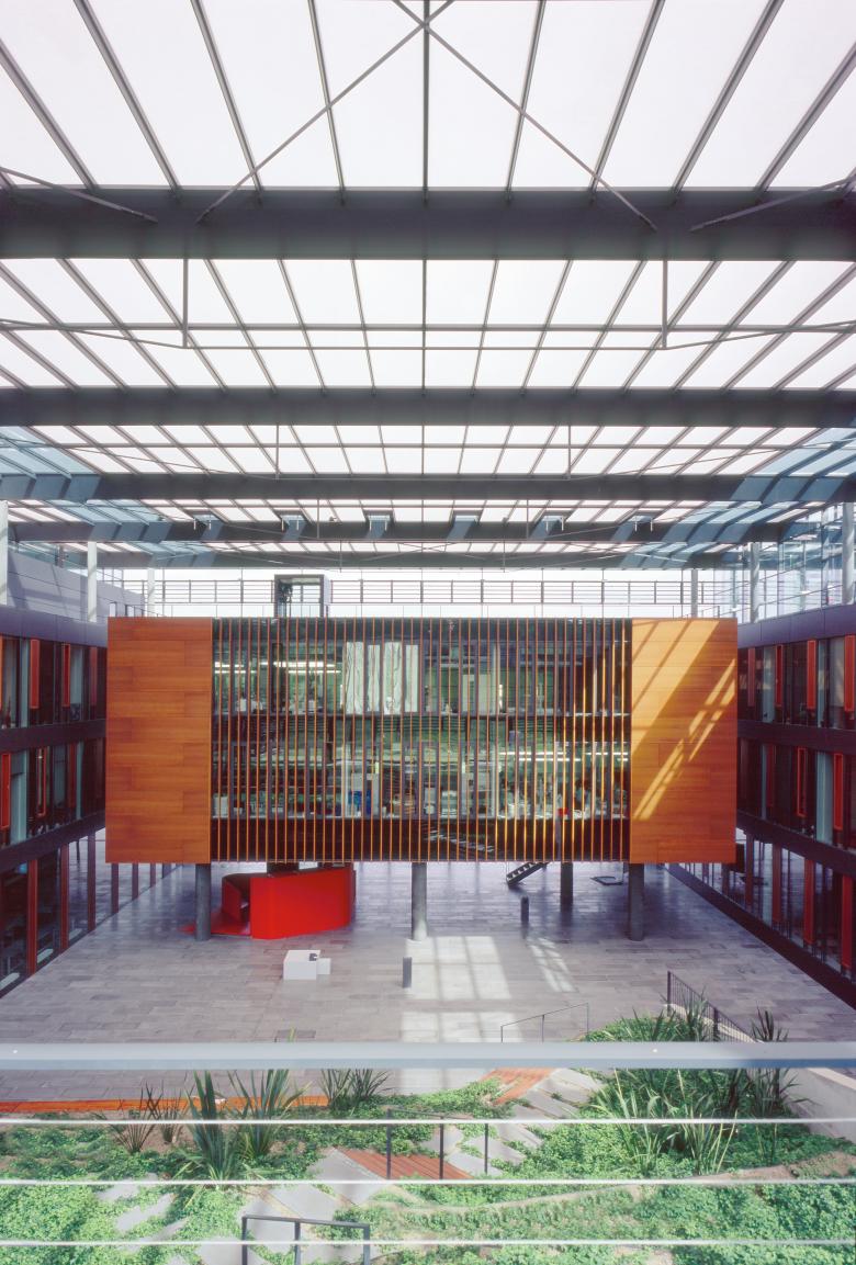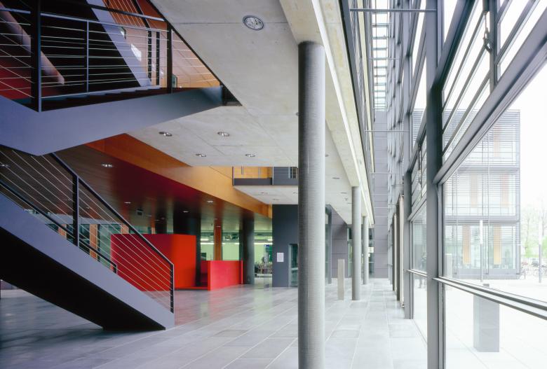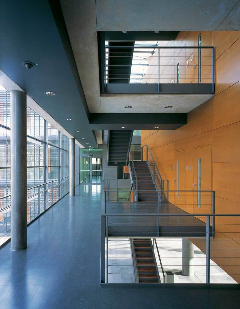 A glazed hall incorporates the surrounding landscape, terrace-like, into the building. It serves as the communication centre for research and science and links the four institutes located in two parallel rows of buildings with anthracite fibre-cement-façades. The solitaire wooden cube within the hall houses the central laboratories.