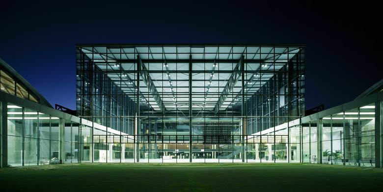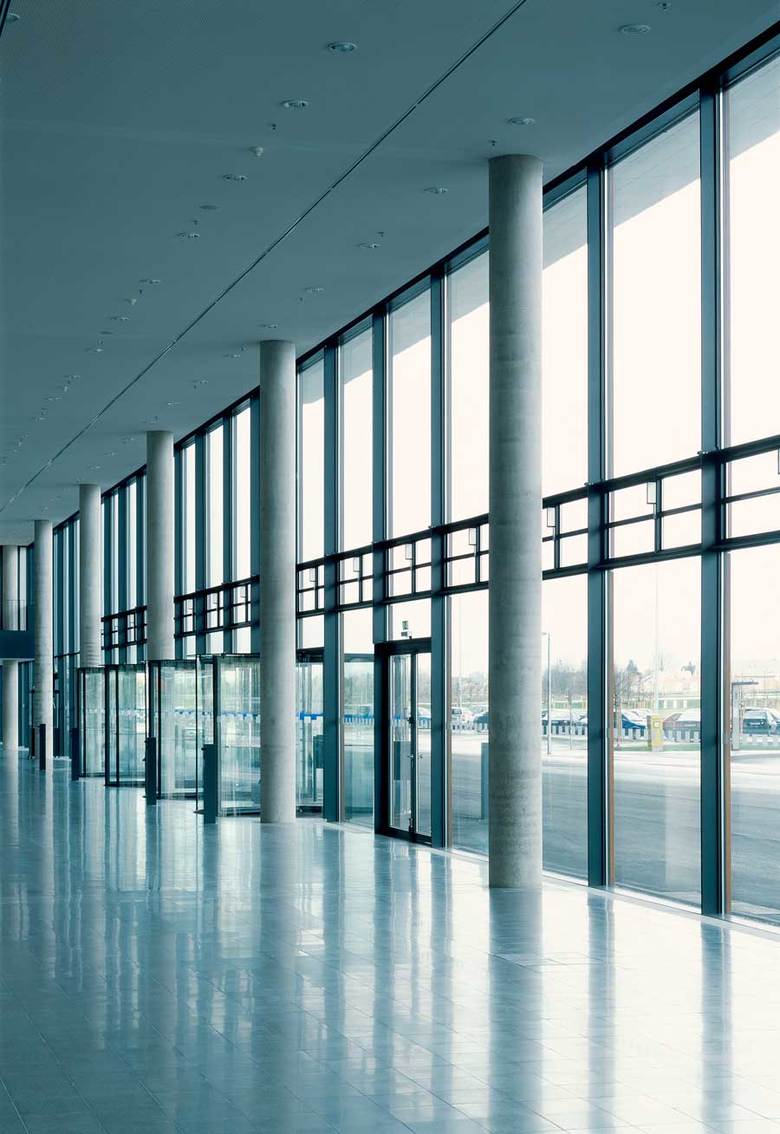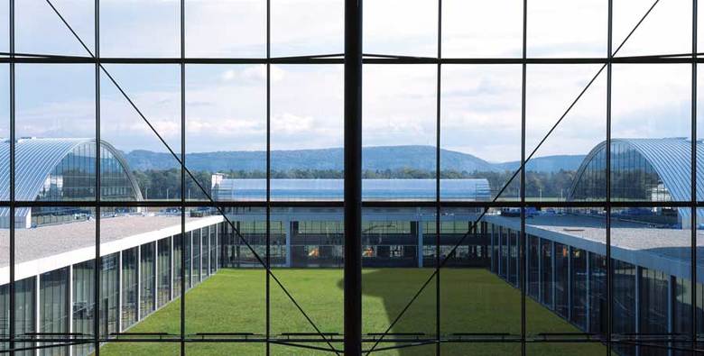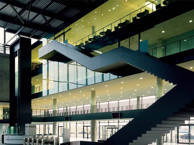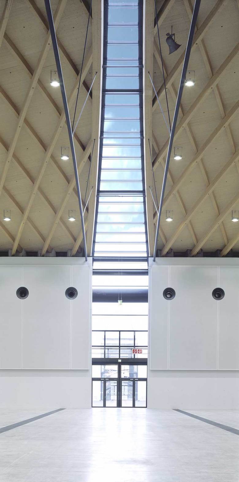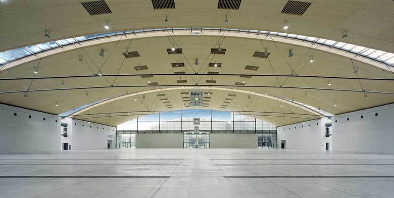 An expansive and seemingly weightless roof characterises the main entrance to the fair. Omnipresent visual links facilitate an easy orientation within all buildings and integrate the open landscape of the Black Forest into all areas. The four pavilions are grouped symmetrically and are spanned by vaulted timber roof constructions without additional columns.