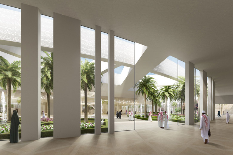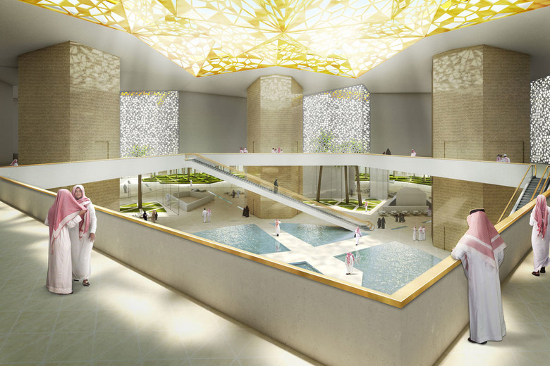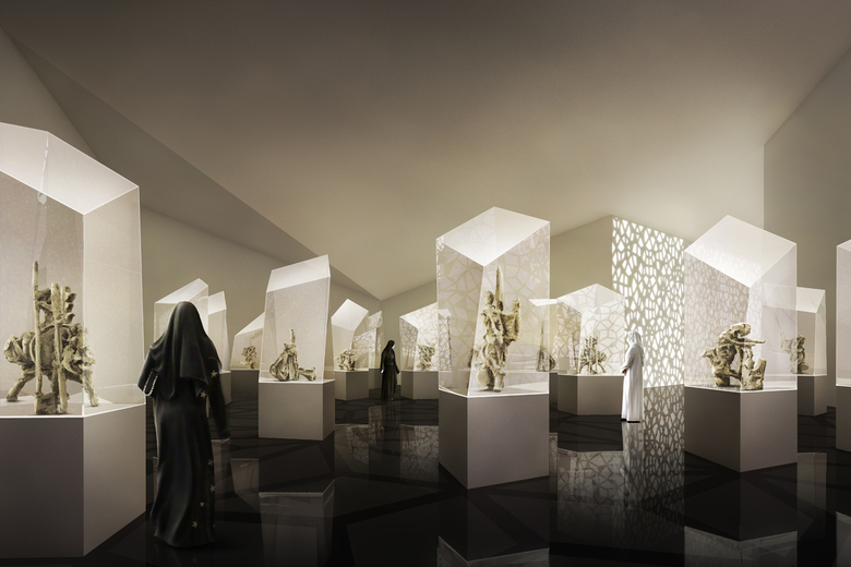 The museum will be accessed via two terraced entrance areas at each end of the former Wadi. The visitor enters the underground central plaza, a foyer which extends over all levels as an atrium, receiving natural daylight through the perforated roof.