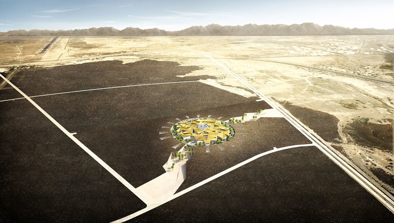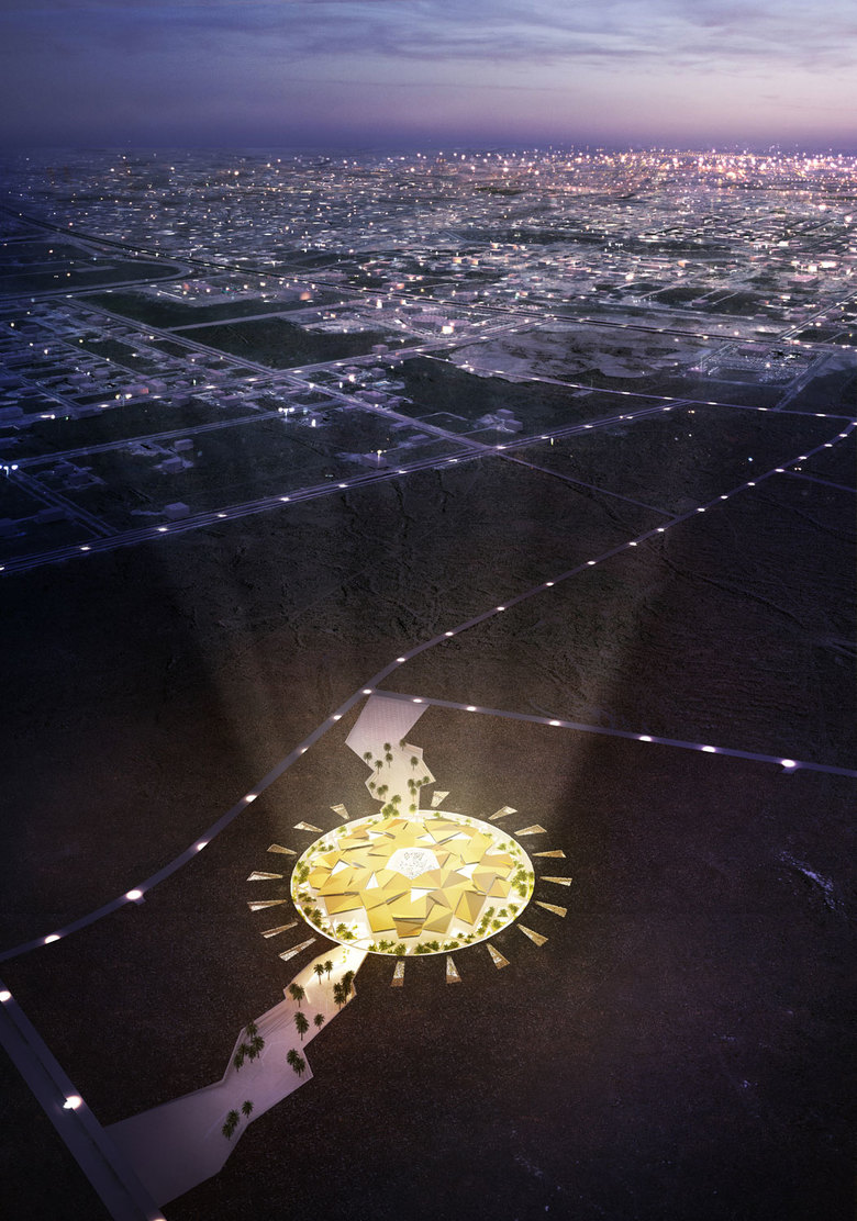 The new museum for the Quran, located in the holy city of Al Madinah al Munawarah, makes a contrast to the barren volvanic landscape with its verdant centre – like a modern oasis. Embedded in a Wadi, the design exploits the topography of this dried-up stream and allows it to be re-experienced as a newly-formed oasis. The roof of the „Nobel Quran Oasis“ will be constructed as a three dimensional sculpture of simple geometric figures reminiscent of traditional Islamic ornamentation and will be entirely covered with gold photovoltaic elements. The landscape design refers to the classical gardens of the Arab world and illustrates central elements of Quran teaching.